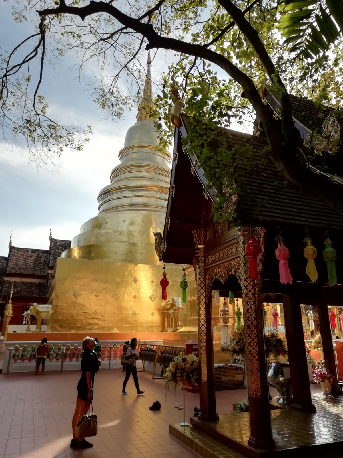 Visitiamo già il primo tempio. Chiang Mai ne ha un’altissima concentrazione e sono tutti molto belli. Noi avevamo già visto quelli di Bangkok ed il confronto è duro da reggere ma ognuno di essi, anche il più piccolo, ha sempre qualche particolarità. Questo ha un mercato all’aperto dove cominciamo ad assaporare gli stick di frutta che in Thailandia si trovano ovunque. Magari l’igiene non sarà proprio perfetta ma trovare il sacchetto con la frutta già pronta, sbucciata e tagliata fa passare sopra a tutto. Troviamo poi un altro tempio con un giardino strepitoso, c’è un piccolo canale con un ponte di legno attorniato da fiori e lanterne appese. Ci ripromettiamo di tornarci col buio ed avremo ragione. Le coloratissime lanterne già belle di giorno, col buio fanno ancora più effetto, intramezzate poi da cespugli di fiori di ogni genere e forma. Miro scatta una foto a mia insaputa dove sono letteralmente a bocca aperta. Non c’è espressione migliore per descrivere quanto vediamo.
