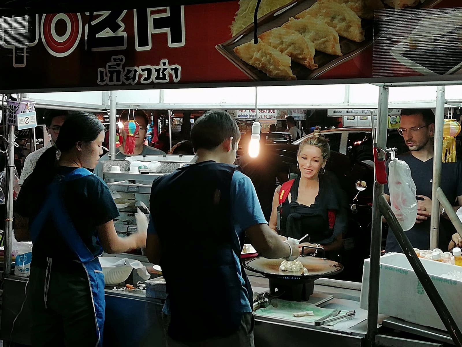 La sera ci dirigiamo subito al night market. Chiang Mai ne ha uno a sud e uno a nord (oppure uno a ovest e l’altro a est….non saprei). Uno è più turistico mentre l’altro è più frequentato dai nativi. Come prima sera scegliamo quello più turistico anche perché nell’altro sembra che quasi nessuno parli inglese. Come primo giorno di vacanza direi che non vogliamo proprio farci del male e stiamo sul “sicuro”. Questi mercati sono un vero e proprio polo di attrazione, esistono in tutti i paesi della Thailandia e sono quanto di più folcloristico ed entusiasmante si possa trovare. Noi sospettiamo che gli stessi tailandesi non mangino mai a casa perché qui il cibo è così buono e conveniente che non vale la pena di stare a casa a prepararsene. Immaginate una via che può essere lunga anche più chilometri, piena di bancarelle di ogni tipo, scarpe, abiti, profumi, giochi, stoffe, ma, soprattutto, cibo! Cibo di ogni genere e forma, di ogni colore e sapore. Cose mai viste e neanche mai immaginate. Non si sa cosa lasciare per cosa prendere. I fritti la fanno da padrone ma non sono da meno il riso e i noodle, i dolci e la frutta. Niente di buono per gli schizzinosi ma per gli altri…fantastico! Assaggiamo per la prima volta delle mezze lune ripiene di verdure e carne scaldate in una padella con un po’ d’olio, non fritte…come primo giorno, torno a ripetere, non vogliamo farci troppo male.