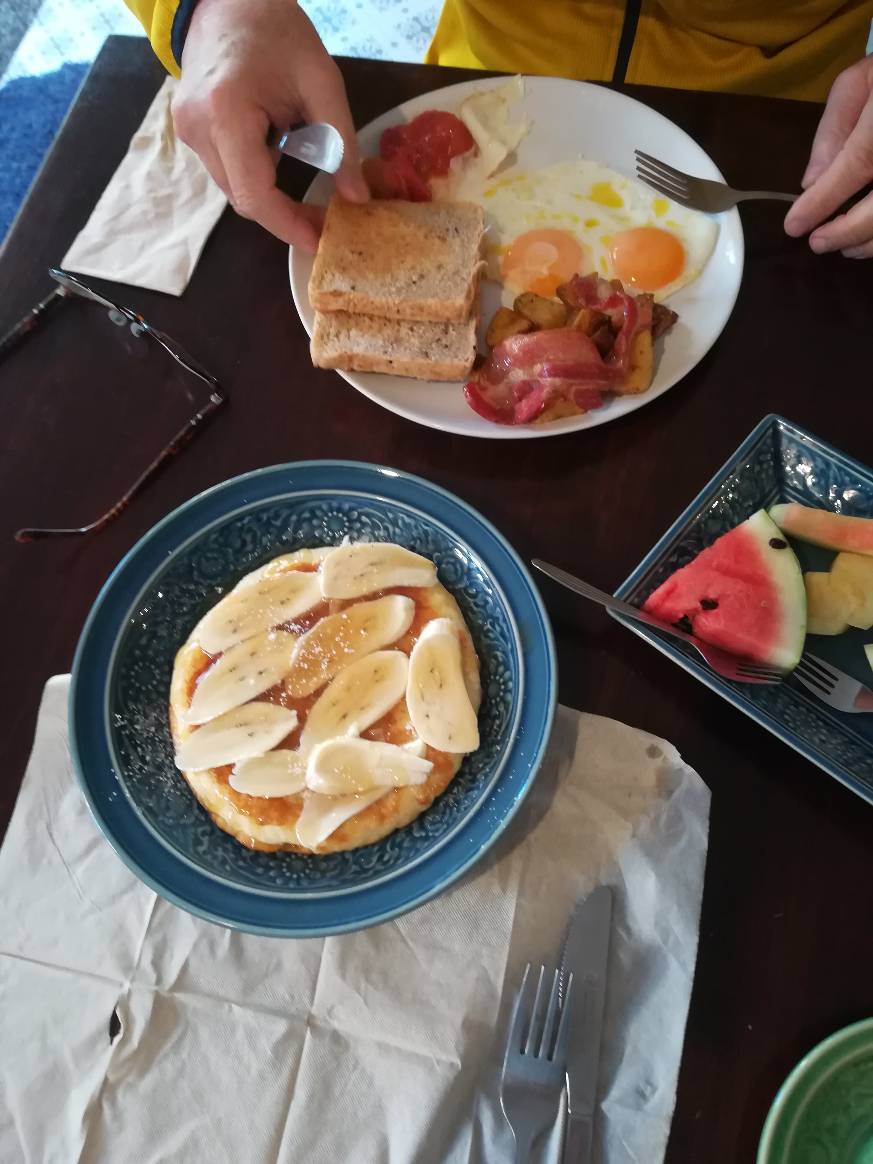 La colazione è quasi esclusivamente a base di uova. Scopriremo poi che il proprietario dell’hotel ha un fornito pollaio proprio dietro il parcheggio. Il caffè è quello di sempre, una bustina di Nescafè e una di latte in polvere sciolte dentro l’acqua calda. Però la frutta e il pane tostato non mancano.