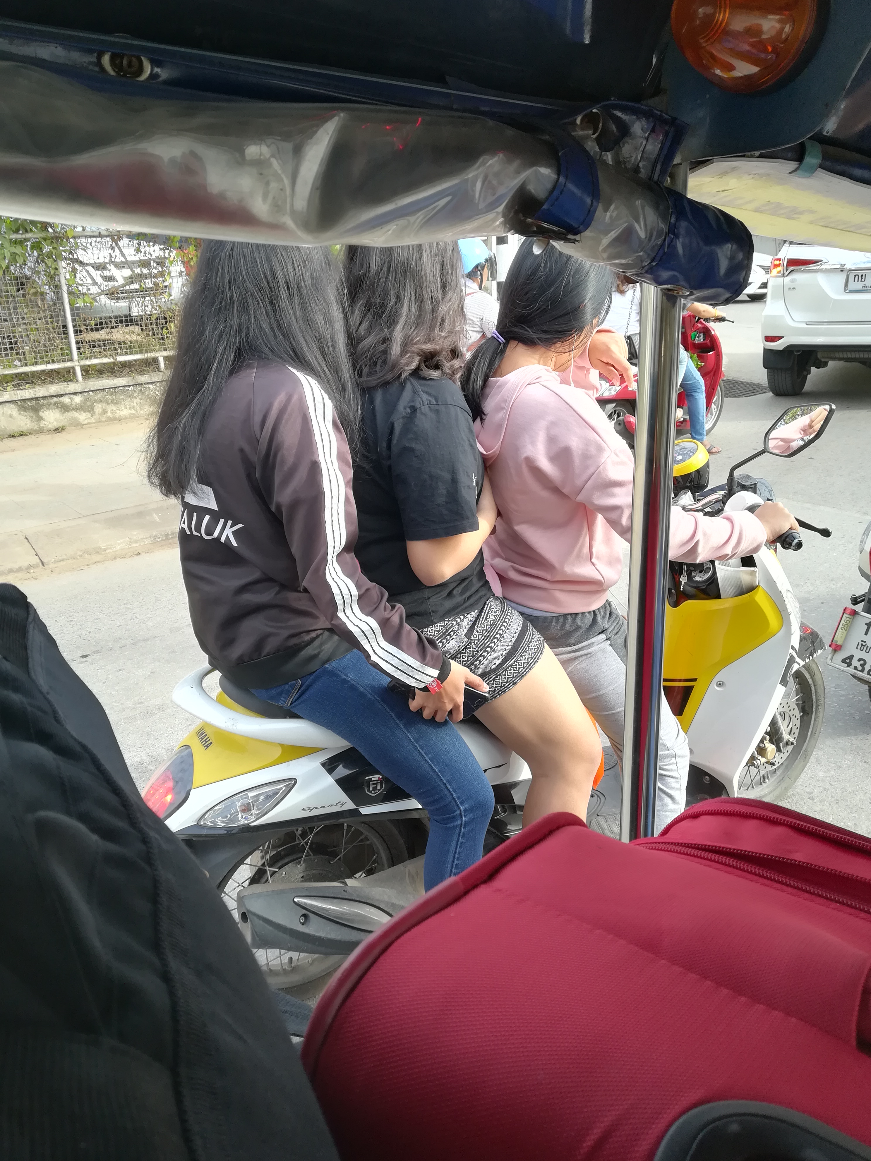 Ogni città della Thailandia, oltre ai taxi, offre vari mezzi di trasporto, dai taxi compartiti, ai tuk-tuk, ai vecchi autobus senza finestrini, fino ai treni che viaggiano con le porte aperte. Tutto si potrebbe dire dei tailandesi tranne che non sappiano come organizzare e gestire i trasporti. Tutto sempre molto chiaro e puntuale. Nei VIP bus hanno perfino la lista dei passeggeri e finchè non ci sono tutti non si parte. Il bus è confortevole e pulito, un’addetta ci dispensa acqua e uno spuntino dato che il viaggio durerà circa 3 ore. La clientela è di ogni tipo e nazionalità, ci sono perfino dei backpackers francesi. Strano, pensavo che questi viaggiatori si servissero solo dei mezzi più economici. All’arrivo al terminal dei bus di Chiang Rai veniamo assaliti dai taxi che qui sono per lo più tuk tuk. Uno ci afferra al volo e fa entrare, non so come, noi e le nostre possenti valigie nel minuscolo abitacolo. Vicino a noi passa di tutto, vecchi carretti che mi ricordano quello dove mio nonno mi portava a vendemmiare, qualche bicicletta, e moltissimi scooter con 3-4 persone a bordo, a volte anche con bambini piccolissimi tenuti in mezzo tra mamma e papà….senza casco.