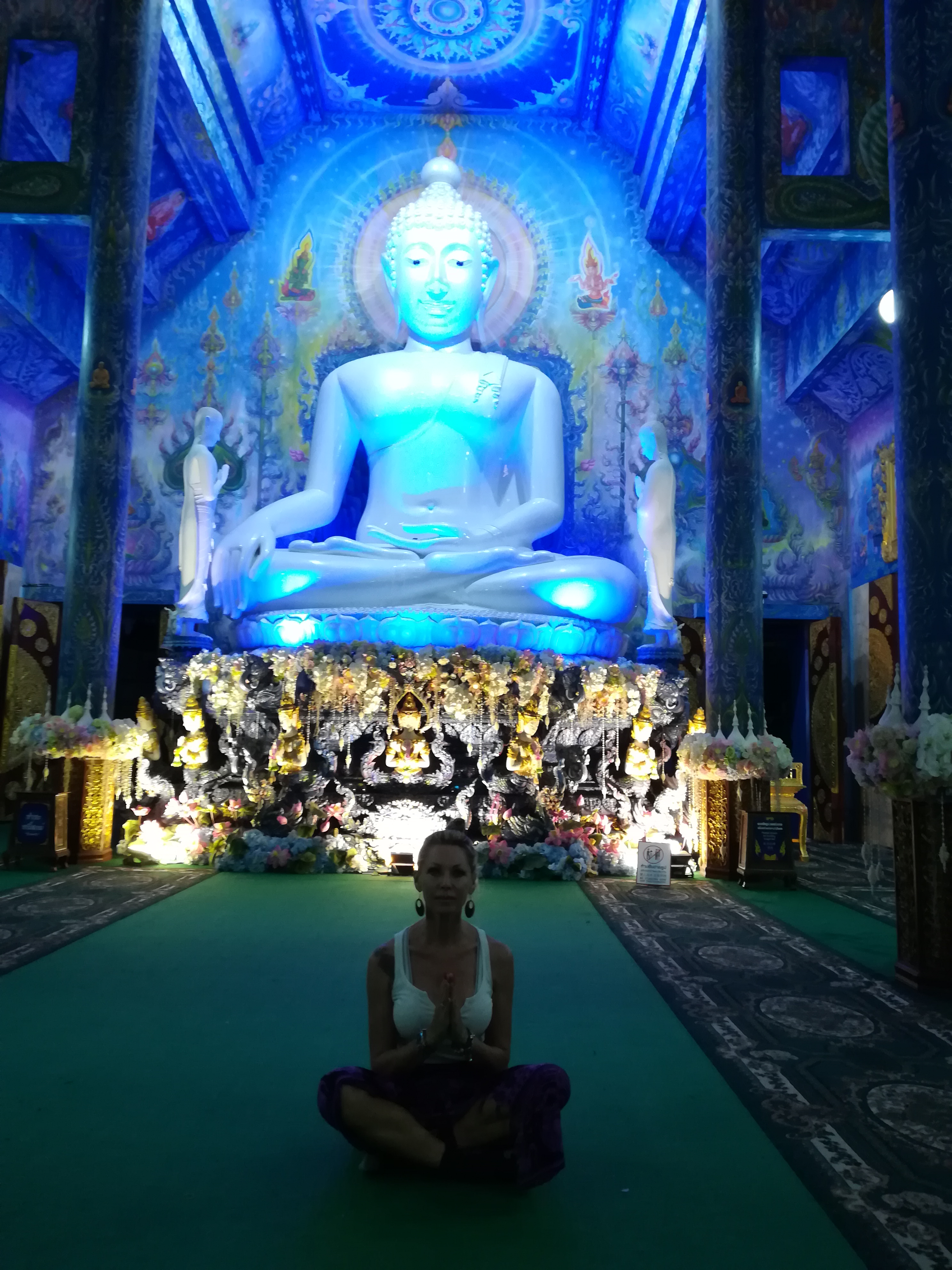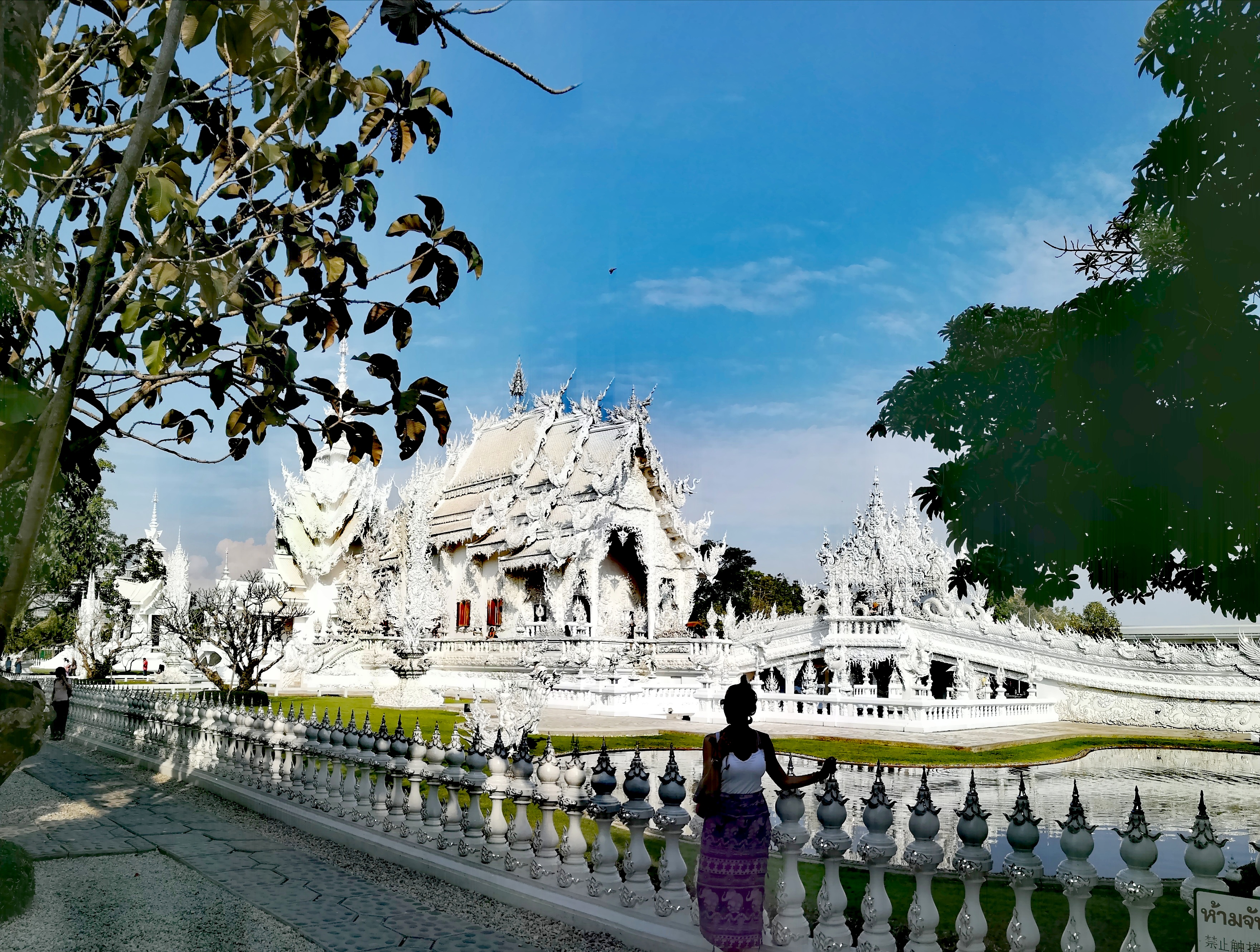 Avevo sempre immaginato di vedere questo tempio in una bella giornata di sole, con il contrasto tra il bianco dell’edificio e l’azzurro del cielo. E sarò accontentata. Il cielo, che sembrava grigio, già da un po’ è diventato blu e mi regala la visione che mi aspettavo. In verità mi immaginavo questo splendido edificio sulla cima di una collina e invece è situato in una piazza con parcheggi ed edifici tutto attorno. Ma rimane comunque una visione spettacolare, è di un bianco candido ed incredibilmente decorato in ogni suo angolo, si potrebbero perdere ore solo per guardare ogni piccolo particolare. È un tempio che ha creato non poche polemiche perché è stato edificato nel 1997 e, pur essendo ricco di simbolismi legati al buddismo, non ne rispecchia la tradizione né all’esterno, che solitamente abbonda di elementi dorati, né all’interno, dove, accanto ai tradizionali dipinti si possono vedere strabilianti disegni rappresentanti il mondo di oggi, come grattacieli, astronavi e perfino personaggi dei cartoni animati. A mio parere non può non piacere.