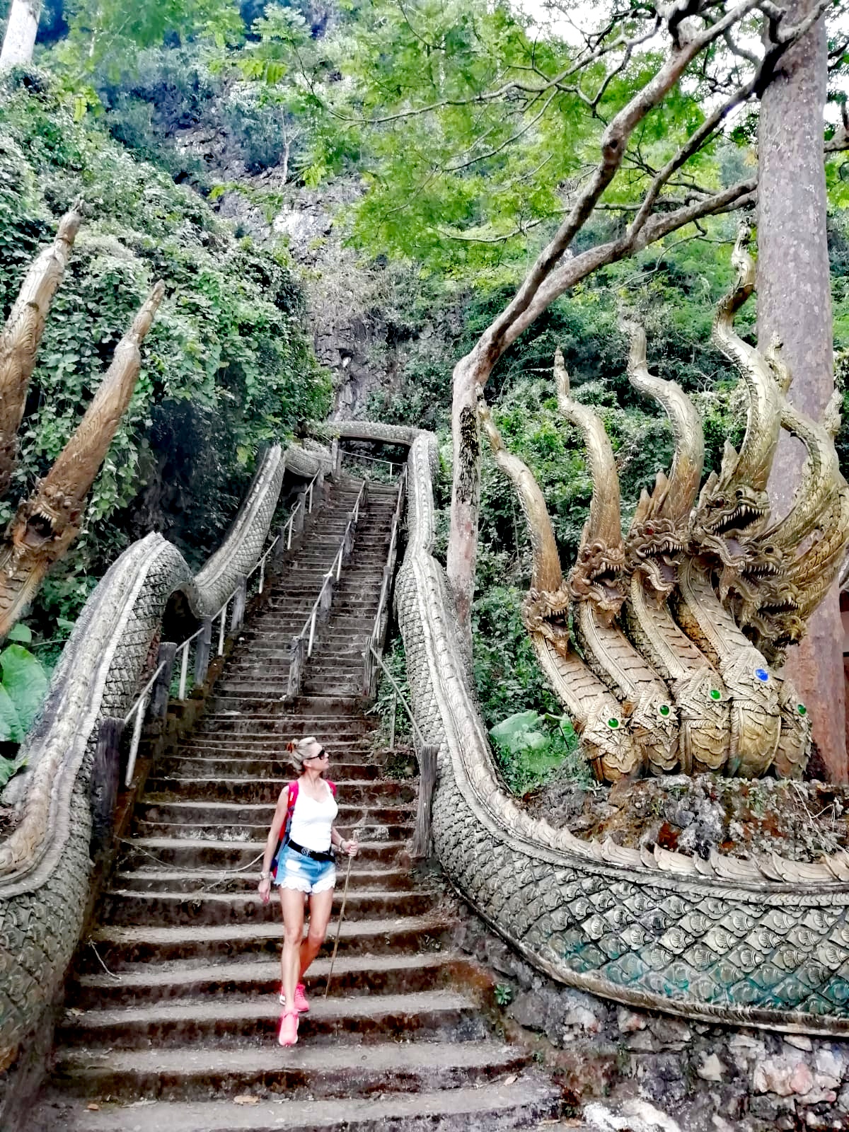 Monkey cave: Ripartiamo per la Monkey cave, dove simpatiche scimmiette assaltano un ragazzo del nostro gruppo che ha in mano una bibita e che pensa bene di lasciargliela. Il posto è assai squallido, ci sono perfino delle bruttissime statue rappresentanti un gruppo musicale che, mettendo una monetina, come quando vuoi usare il cannocchiale per vedere il panorama, intonano qualche nota muovendosi in maniera spettrale. Una scena così di fronte a un tempio religioso è davvero inguardabile. L’unica cosa degna di nota è una bellissima scalinata che però non abbiamo il tempo di percorrere. Come già detto, in queste gite si fa tutto un po’ di corsa. Però il tempo per mangiare ce l’abbiamo. Ci fermiamo lungo la strada in un chiosco abbastanza capiente per accogliere noi e, probabilmente, tutti i partecipanti a questo genere di gite. Il menu è unico per tutti: una zuppa che sembra acqua calda con un po’ di verdure galleggianti e noodle. Sarà perché, a differenza dell’anno scorso, quest’anno sto apprezzando molto il cibo tailandese o forse perché sono affamata, ma mi sembrano buonissimi. Poco piccanti e perfettamente conditi con uova e verdure.