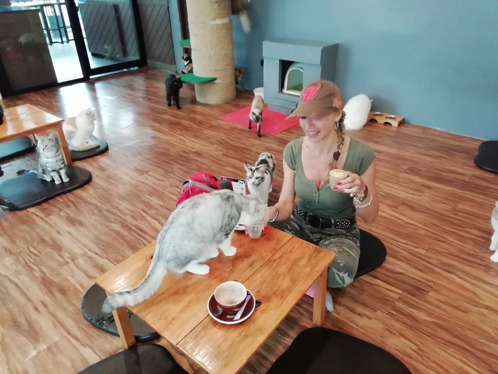 Dopo il relax abbiamo bisogno di un buon caffè per darci una mossa. Di fronte al centro massaggi vediamo un locale chiamato Cat’n’ A Cup Cat Cafe dove si puà fare colazione circondati da bellissimi gatti. So che anche in Italia esistono locali simili ma per noi è la prima volta. Entriamo scalzi, come in tantissimi locali della Thailandia e ci accomodiamo per terra, vicino a dei tavolini molto bassi. Le cameriere ci porgono subito le regole da seguire, tutte rivolte al rispetto per i gatti. Ce ne saranno una ventina, di ogni colore e razza, dai persiani ai siamesi, dai tigrati ai chiari, tutti diversi ma ugualmente bellissimi e pulitissimi. Si accoccolano immediatamente vicino a noi e tra il buonissimo cappuccino e le loro fusa non vorremmo più uscire. È un’esperienza che ricorderemo con moltissimo piacere.