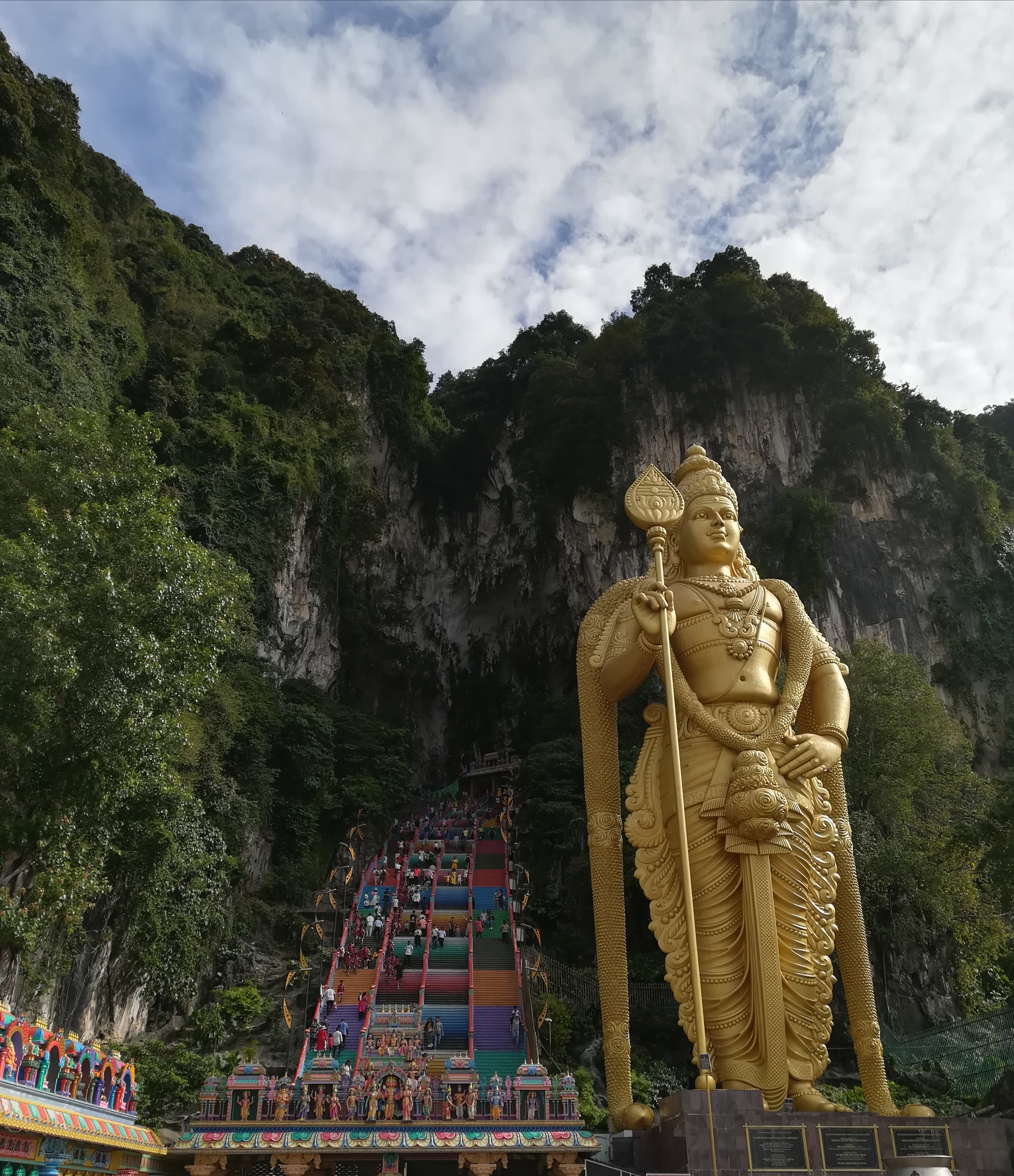 Dopo circa 40 minuti arriviamo alle cave, la cui visita è gratuita. Notiamo immediatamente l’enorme statua che ci accoglie all’entrata del complesso. Rappresenta uno dei figli di Shiva, uno tra i più importanti dei per la comunità Hindu. Oltre ai suoi 43 metri di altezza e al suo colore interamente dorato, ci lasciamo colpire dall’intero contesto. Immediatamente dietro alla statua c’è una grande e ripida scalinata colorata che sembra incastonata tra il verde e le rocce retrostanti e che porta direttamente dentro le cave e, davanti alla scalinata, c’è un coloratissimo tempio indiano.
