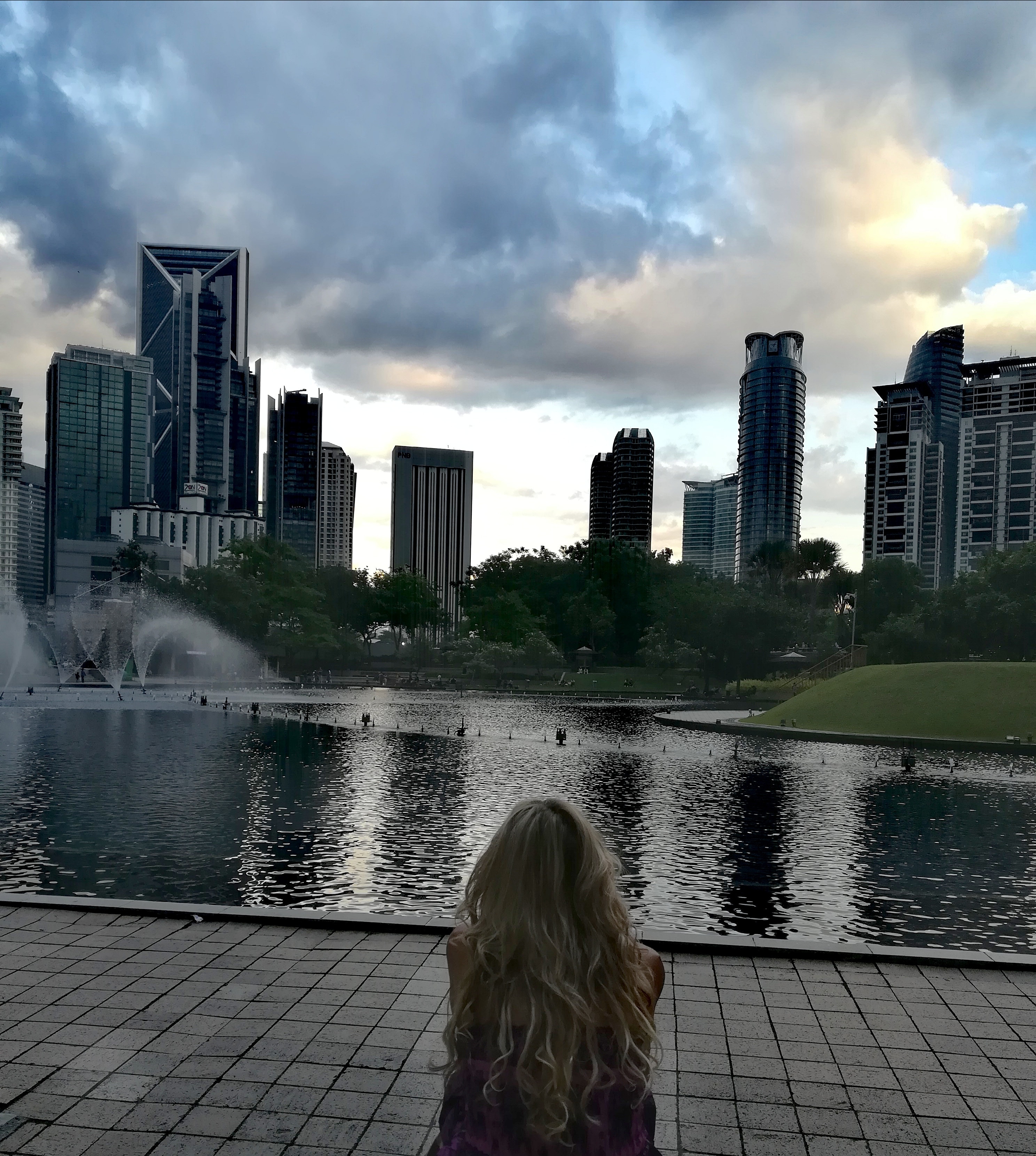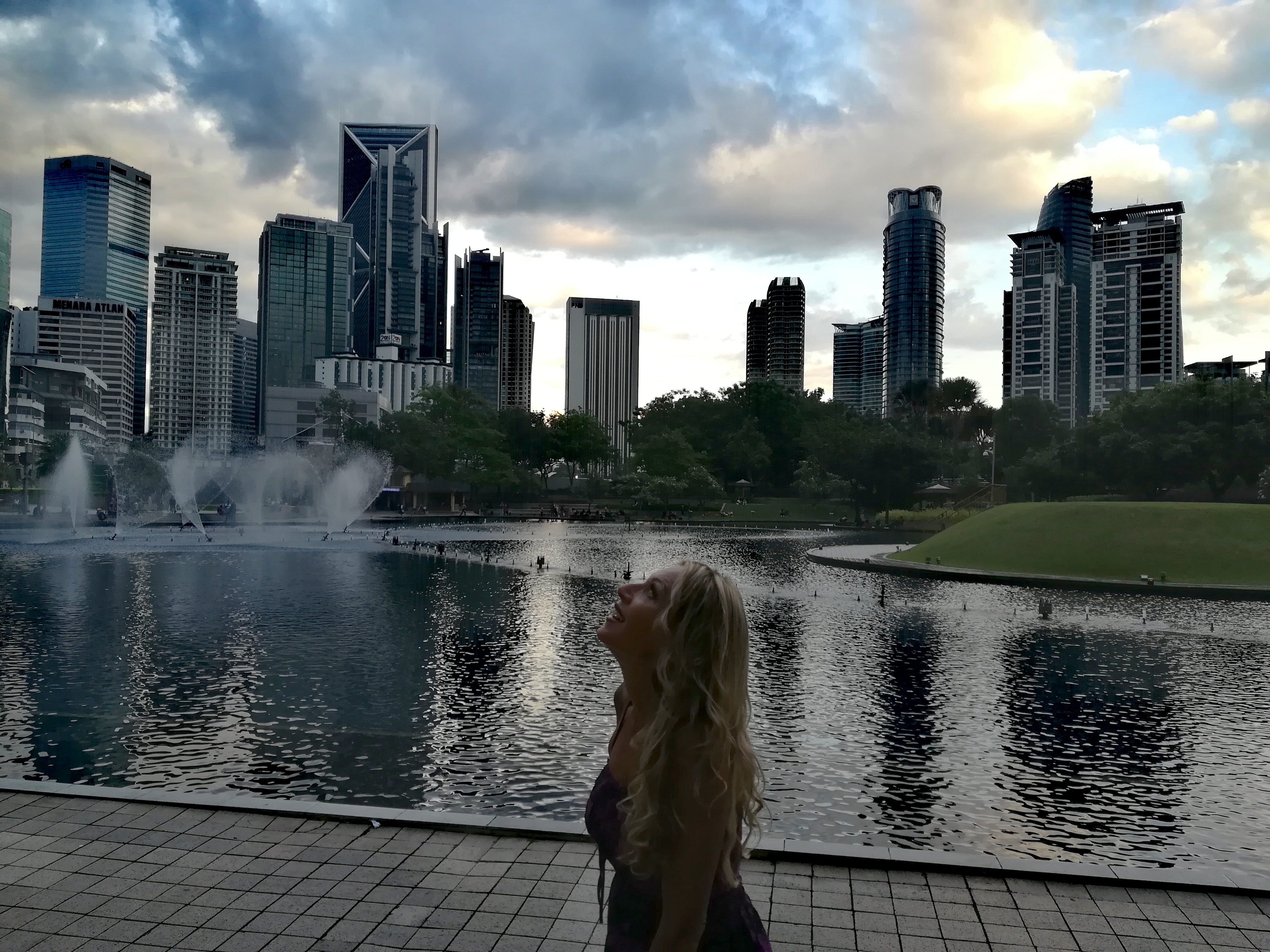 Basta shopping, si va a prepararsi per l’evento della serata, la salita alle Petronas. Percorriamo a piedi la strada che ci porta alle torri, beandoci del tramonto e delle prime luci che cominciano ad accendersi in questa scintillante città. Il parco adiacente alle torri è davvero bellissimo, con un’enorme fontana che in verità si potrebbe chiamare lago per quanto è grande, confinante con un grande polmone verde che ricorda un po’ il Central Park di New York, dove molte persone fanno jogging, esercizi ginnici o semplicemente una passeggiata o un giro in bici. Un largo cerchio con bar e ristoranti fa da contorno al tutto.