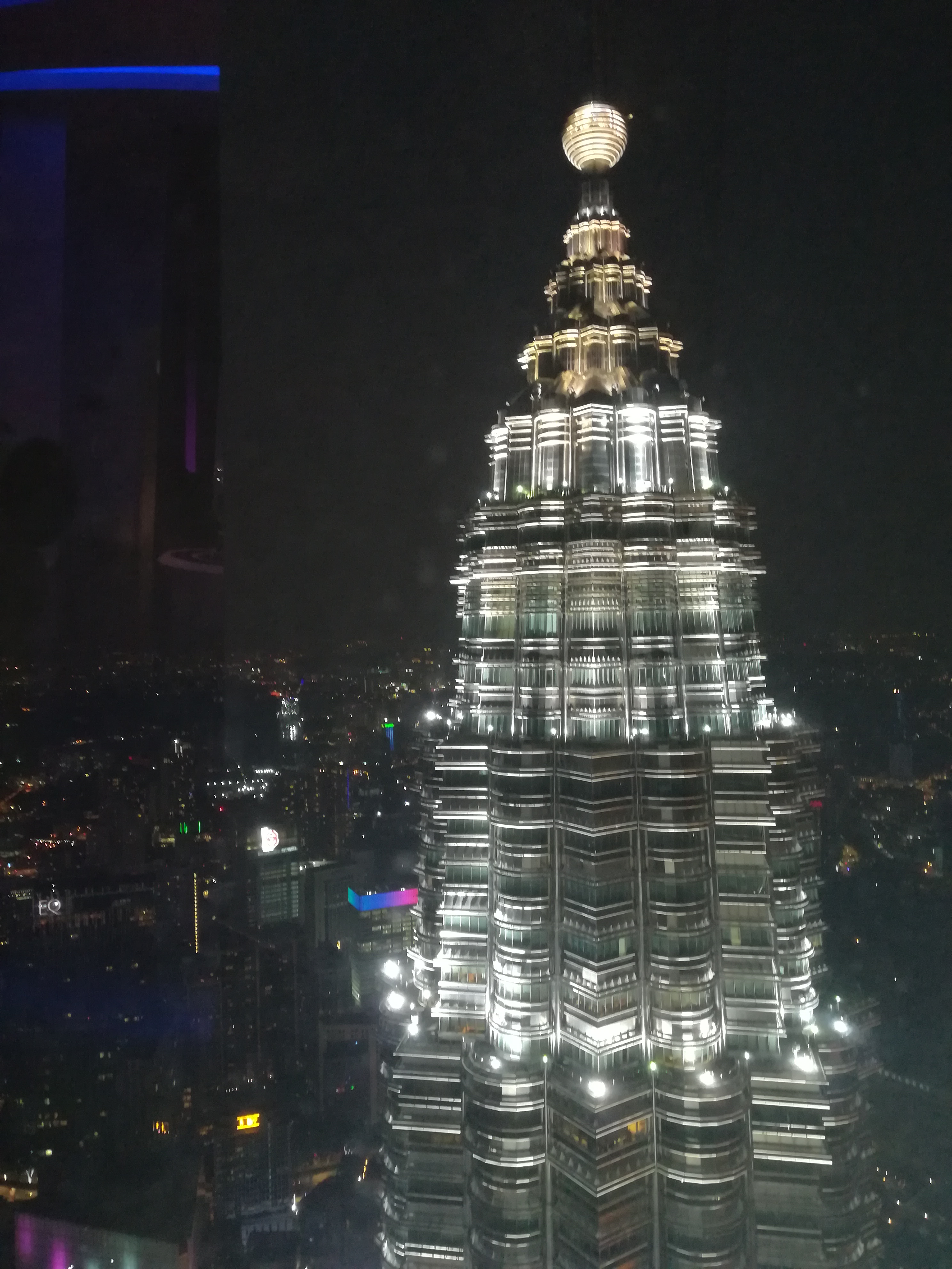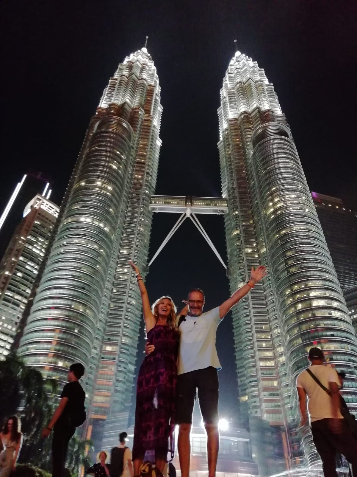 E ora via, verso le Petronas. Arriviamo con un po’ di anticipo ma comincia già a fare buio e perciò possiamo finalmente vederle illuminate. Anche di sera, come di giorno, forse anche grazie alle numerose foto che abbiamo visto, sono proprio come ce le immaginavamo, imponenti e stupefacenti. Facciamo un miliardo di foto e non siamo gli unici, i turisti sono davvero numerosi, tutti col naso per aria ad ammirare quest’opera ingegneristica di grandissimo effetto. Ci riempiamo gli occhi più che possiamo ed entriamo, pronti a metterci in fila per l’ascensione. Si entra a gruppi di circa 20 persone. Un’hostess ci accompagna e ci fa salire sul primo ascensore che in pochissimi secondi ci porta al 40mo piano, dove si trova il ponte che attraversa le due torri. L’unica cosa che ti fa percepire l’altezza sono le orecchie che si chiudono, per il resto non ci si accorge di niente, sembra di essere appena saliti sull’ascensore e invece si è già arrivati. Scendiamo per camminare e ammirare il corridoio. Bello vedere la città dall’alto, con tutte quelle luci tutto attorno e le persone così piccole. Poi, in gruppi più piccoli, prendiamo un secondo ascensore che ci porta all’80mo piano. Qui sì che ci si sente altissimi. Appena si esce dall’ascensore ci si trova di fronte la punta dell’altra torre, con quella sua forma esagonale così particolare e luminosa, sembra fatta di cristallo e argento. Guardo giù e le persone mi sembrano quasi invisibili ma approfitto dei binocoli messi ad ogni angolo per vederle meglio. Riesco ad individuare un campo di calcio con i giocatori che si allenano in notturna e dei meravigliosi rooftop con piscina. È tutto così colorato e vivo. Lo skyline è davvero unico. Rimaniamo qui finché la nostra accompagnatrice ci chiama per ritornare, ma siamo soddisfatti della visita e torniamo volentieri coi piedi a terra.