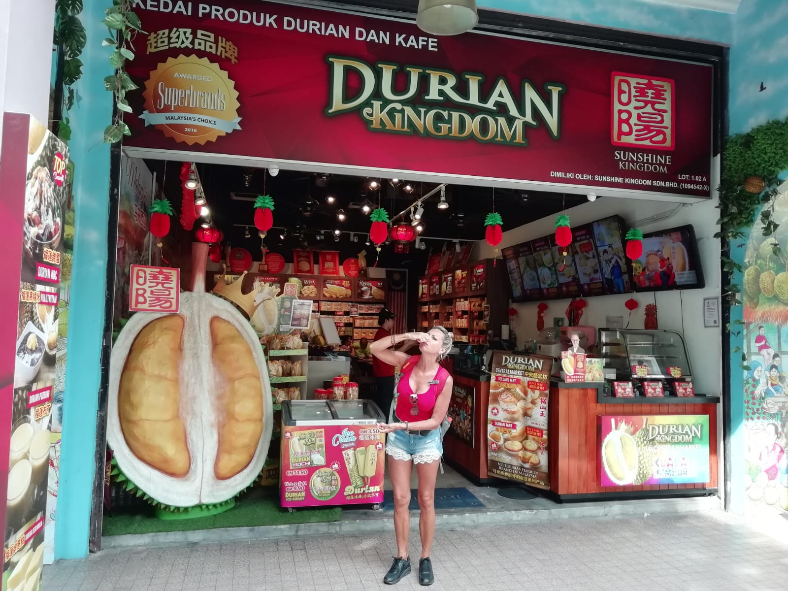 Molto apprezzati qui sono anche i numerosi centri commerciali. Ce ne sono per gli amanti della tecnologia, della moda firmata e non, del cibo e di qualsiasi altra cosa. Quello chiamato Times Square ha pure delle montagne russe all’interno. Noi non riusciamo a trovarle ma il centro commerciale è così grande che non abbiamo voglia di girarlo tutto anche perché, se mai le trovassimo, a Miro non piace andarci e perciò che le cerchiamo a fare. Oggi ce la prendiamo comoda e girovaghiamo senza meta con l’unico scopo di cercare i souvenir da portare a casa. Gli oggetti più belli e caratteristici li troviamo al Central Market, foulard, saponi, tisane e prodotti derivati dal famoso durian. Il durian è considerato il frutto più puzzolente al mondo e in molti luoghi pubblici dell’Asia è perfino proibito. Qui ne fanno una prelibatezza, tanto da prepararne caramelle, succhi, biscotti e qualsiasi cosa si possa produrre con un frutto. Siamo curiosissimi ma la consistenza molle e il terrore di annusarlo ci frena dal provarlo. Ci azzardiamo solamente ad assaggiare delle caramelle. La consistenza è gommosa e il colore è marrone chiaro, sembrano caramelle al mou ma il gusto è decisamente differente, un mix di dolce e piccante assieme, con un retrogusto di spezie che rimane attaccato alle papille gustative per ore. Viene proprio da chiedersi perché sia così amato e costoso rispetto agli altri frutti. Che sia solo una questione turistica-economica? Anche noi, sebbene non ne rimaniamo rapiti, ne prendiamo qualche sacchetto per i nostri amici. L’idea di regalare caramelle derivanti da un frutto che in Italia nessuno conosce e che viene considerato come il più puzzolente al mondo ce lo fa risultare simpatico e originale.