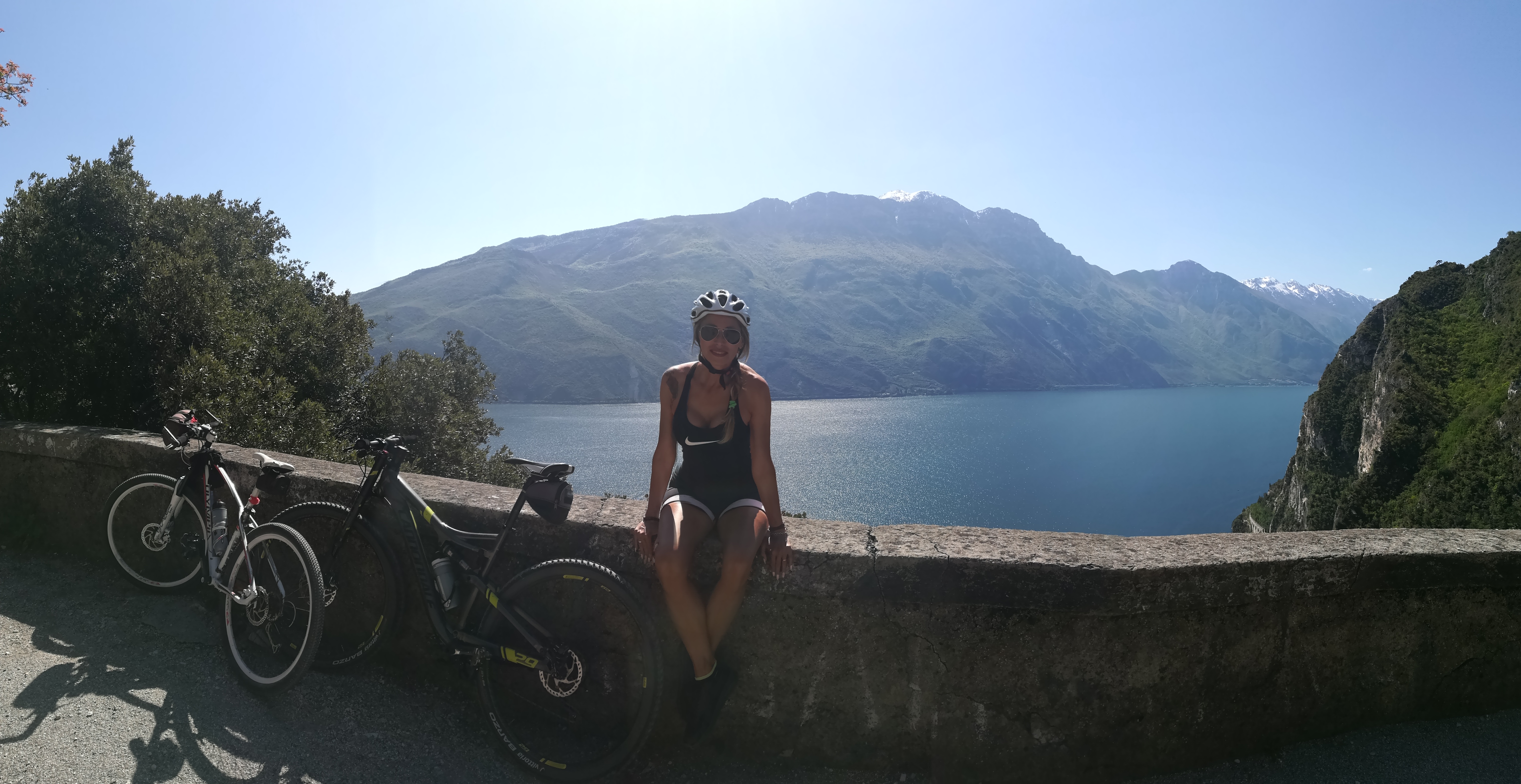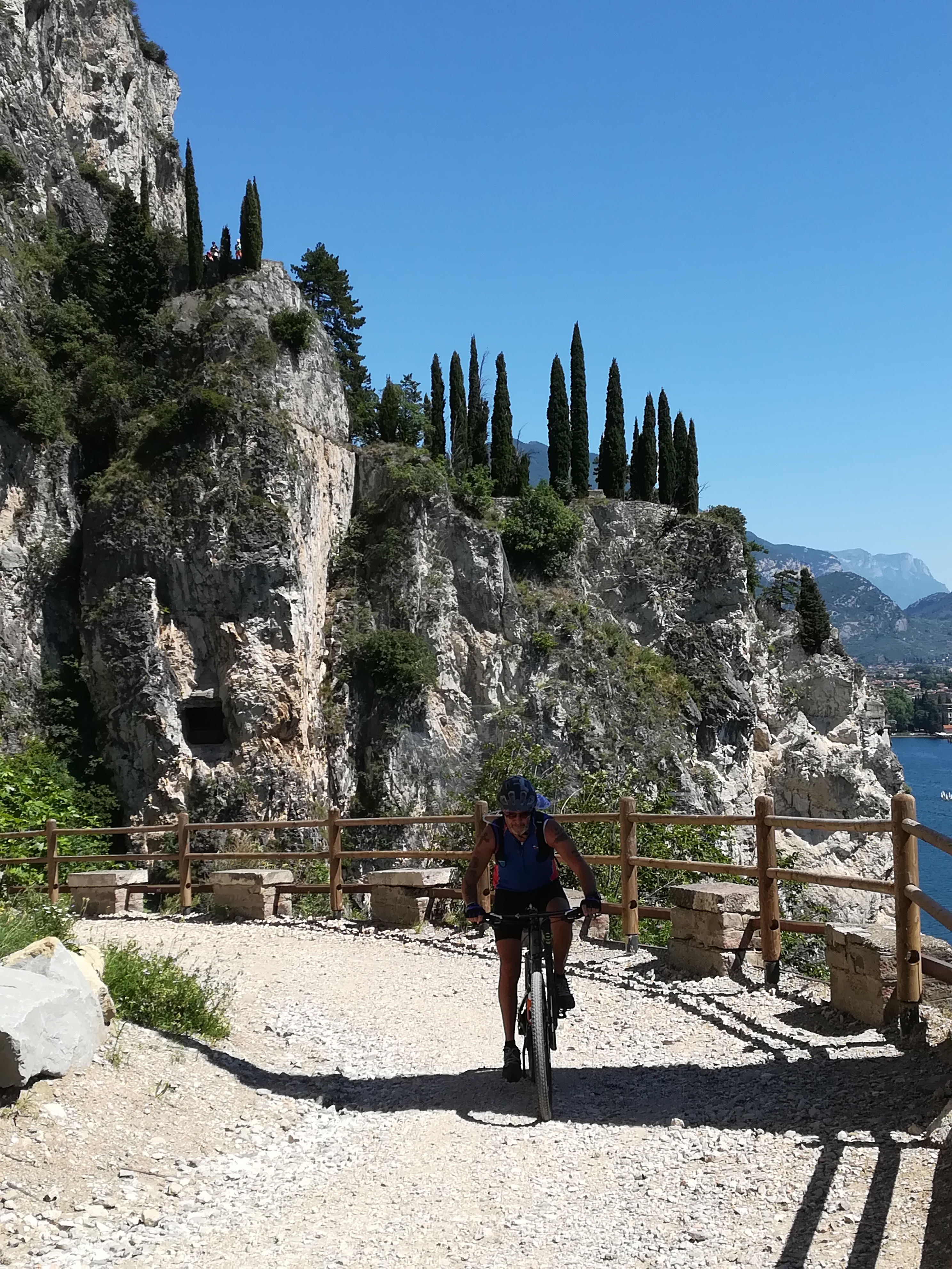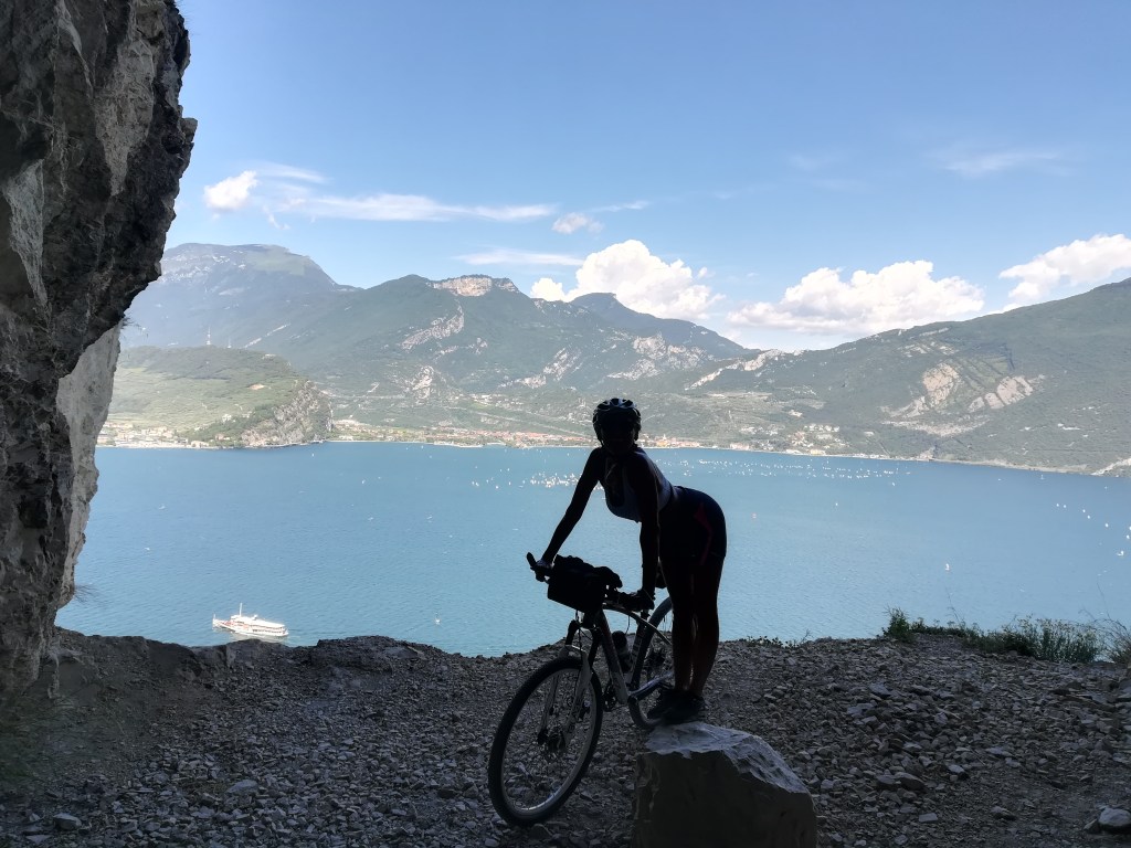 Un tornante dopo l’altro proseguiamo sempre con una discreta fatica data la pendenza del percorso ma non ce ne curiamo perché ad ogni nuova curva c’è la vista spettacolare del lago e di Riva del Garda che ci fa compagnia