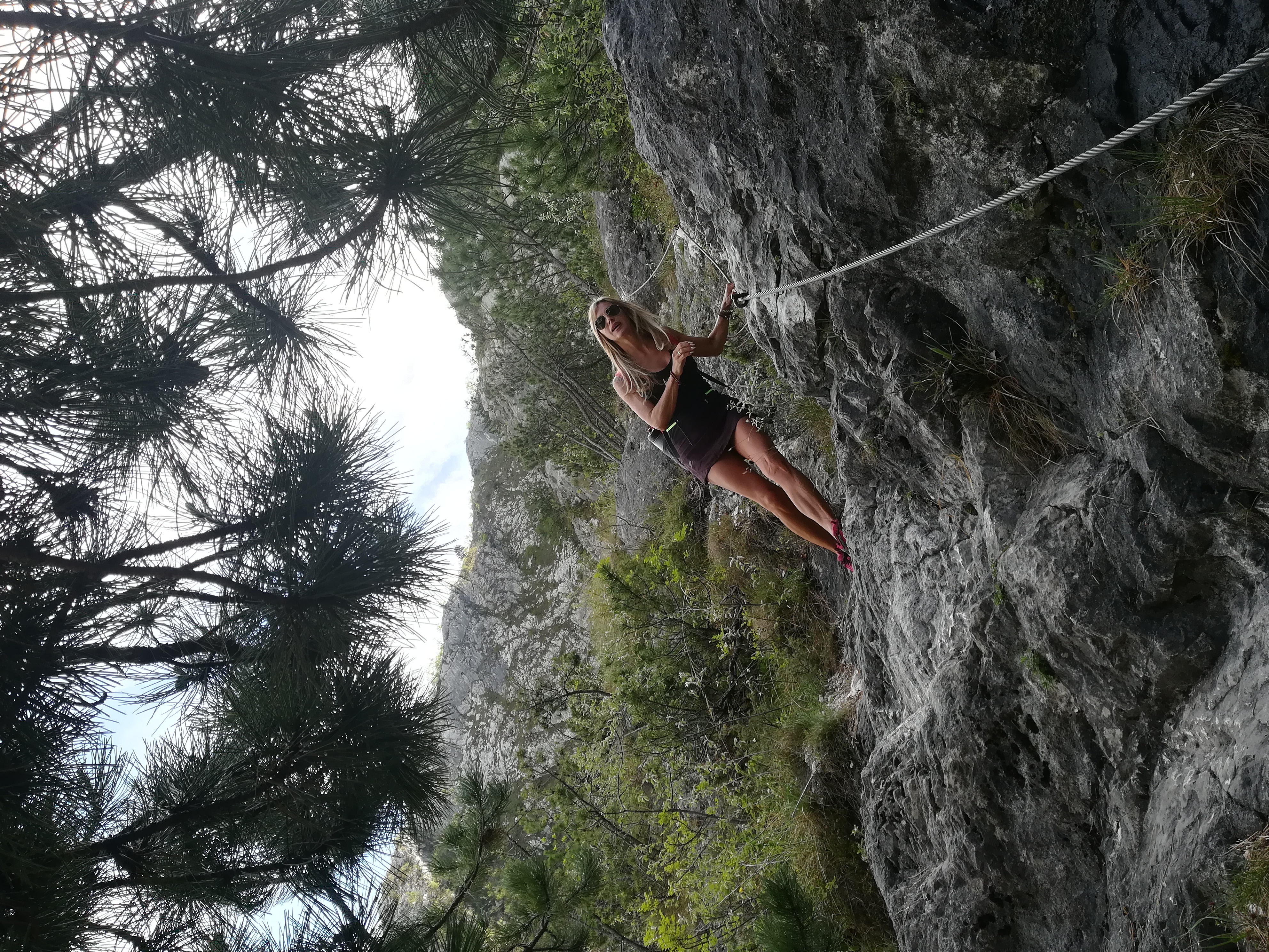 Però, prima di ritornare giù, siamo curiosi di andare a vedere la Ferrata dell’Amicizia che risale le ripide pareti del monte Rocchetta e termina a cima Sat. Sappiamo che è una delle più frequentate dell’arco alpino e difatti incontriamo numerosi escursionisti muniti di imbragatura e caschetto. Noi oggi non siamo attrezzati per completarla ma ci togliamo la voglia di vedere com’è e di farne un piccolo pezzo. Riusciamo a farcene un’idea e pensiamo che debba essere davvero entusiasmante, tutta a picco su Riva, con questa imponente parete e questi pioli, funi e scale che portano a 1260 metri e ad un panorama sui monti circostanti e sul lago che sicuramente toglie il fiato.