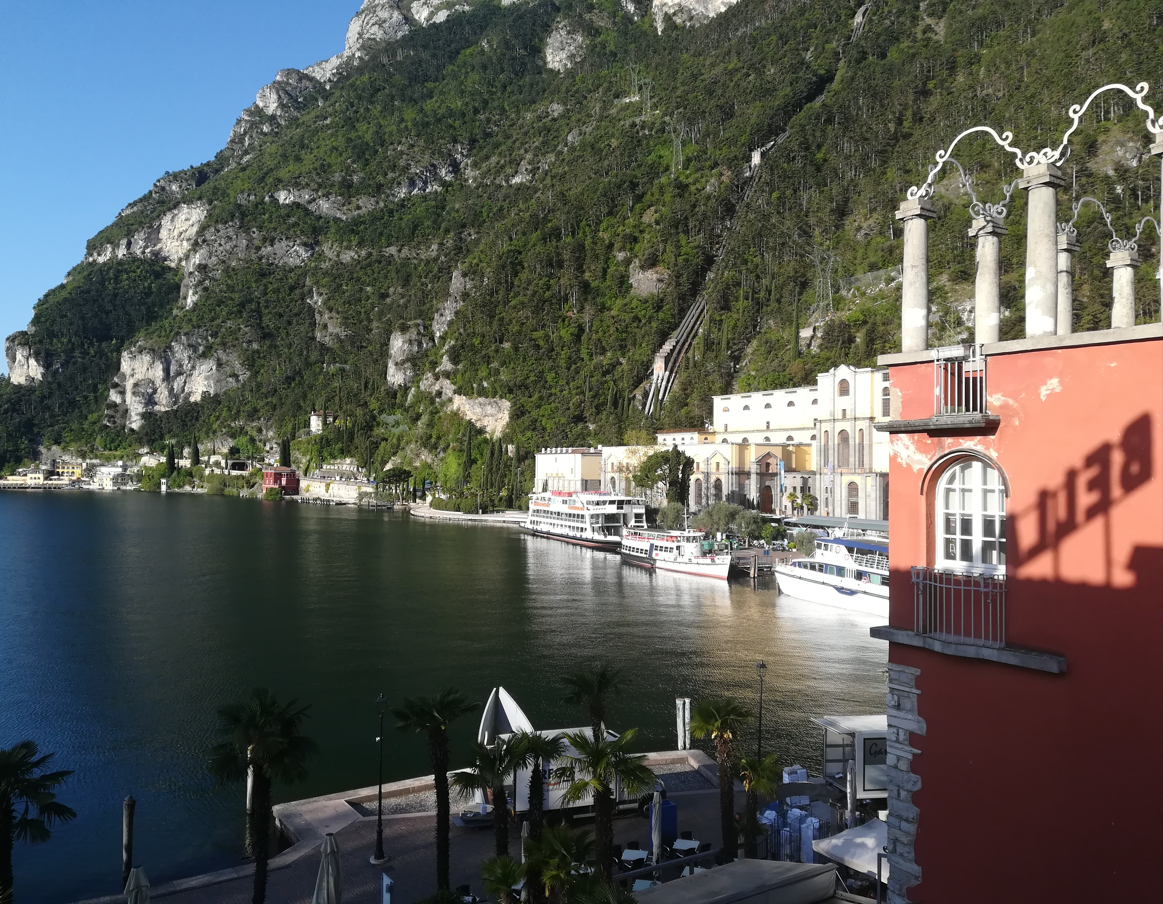 Il primo tratto è davvero ripido ma si addolcisce quasi immediatamente, pur rimanendo sempre in salita. Impossibile non rimanere estasiati già dai primi metri. Il panorama che si apre davanti agli occhi è veramente unico. Le acque del lago sulla sinistra disseminate da una moltitudine di vele bianche e la strada, interamente scavata nella roccia, intervallata da passaggi in galleria a passaggi a picco sul lago. Mano a mano che si prosegue il panorama diventa ancora più bello perché si apre ancora di più su tutto il territorio circostante, con le rive del lago e i suoi porticcioli, le barche con le loro vele immacolate, il verde delle colline vicine e le montagne a fare da contorno a tanta bellezza.