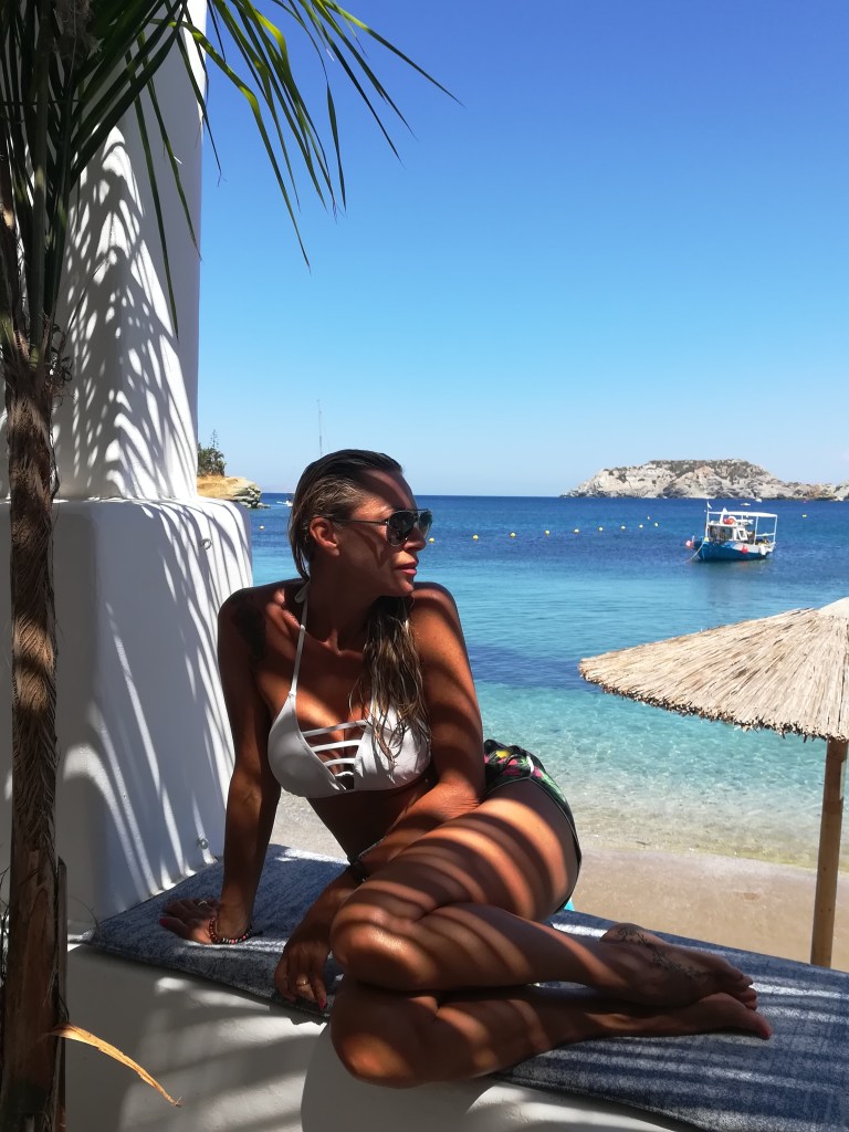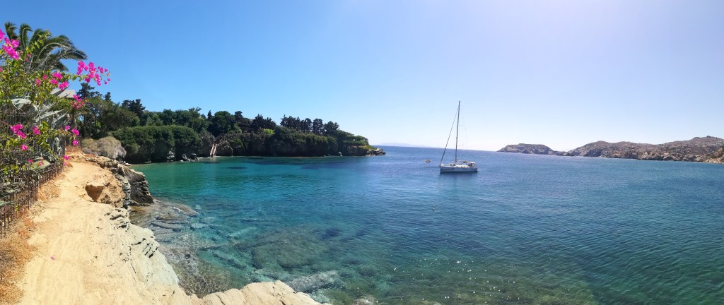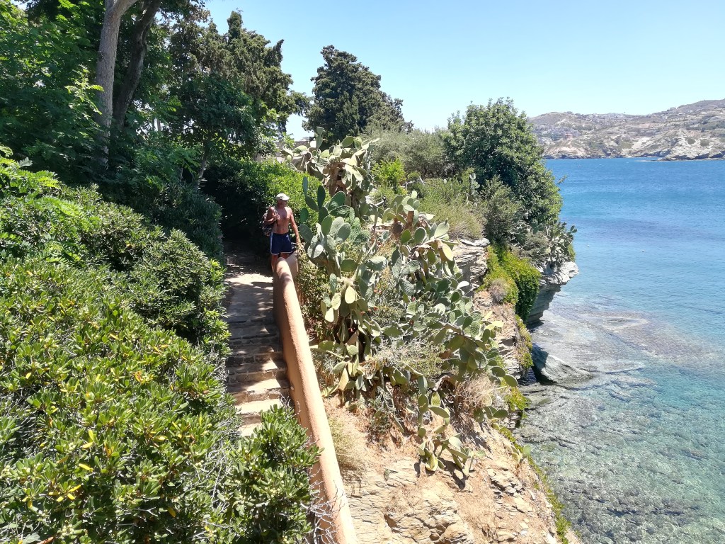 La prima impressione non è affatto buona. La spiaggia è cortissima con un’unica fila di sdrai vicinissimi tra loro. Il caldo è soffocante e non c’è un filo d’aria, però ci sono dei bei locali, tra i quali ne spicca uno, l’Almyra, tutto bianco e azzurro, che è lo stesso convenzionato con il parcheggio. Mi rifiuto di fermarmi qui ma vedo un sentiero sulla sinistra con delle rocce piatte a picco sul mare che mi sembrano più invitanti dei lettini. Ci andiamo e siamo piacevolmente accolti da una leggera e rinfrescante brezza. Ah…qui sì che si sta bene, sarà anche meno morbido ma sicuramente lo preferiamo. Entriamo immediatamente in acqua che è molto invitante, pulitissima e trasparente, come in tutte le spiagge di Creta che abbiamo visto finora. Miro sparisce per fare l’esploratore e scopre un sentiero che passa dietro un lussuoso hotel e che si spinge fino all’altro lato degli scogli, dove, attraverso una scalinata, si può arrivare ad una spiaggetta semideserta. Ci andiamo assieme, passiamo tra bellissime piante e stupendi scorci fino a rituffarci in un mare che qui è ancora più blu. Poco lontano ci sono un paio di barche attraccate e arrivano anche un paio di kayak.