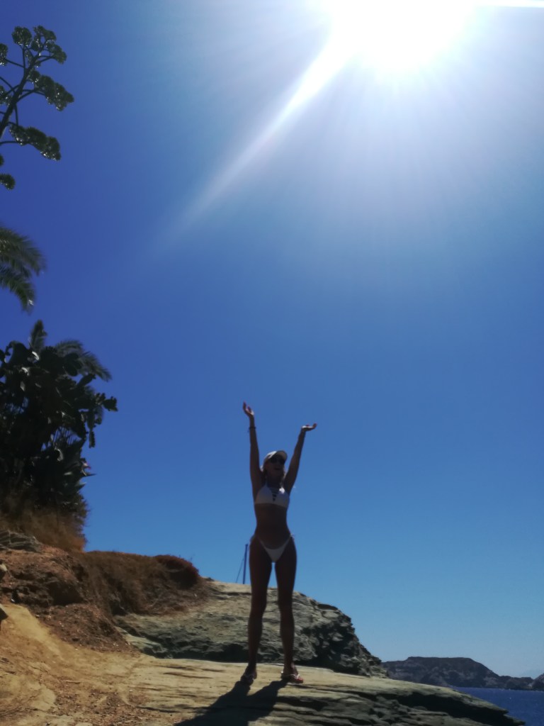 Siamo un po’ stanchi di girare a destra e a manca e perciò decidiamo di ritornare nella spiaggia più vicina a Heraklion, ad Agia Pelagia. Mi immergo immediatamente in questa fantastica acqua e mi guardo placidamente attorno, condividendo la gioia di chi, come me, si illumina vedendone i colori, dalle famiglie tedesche con i ragazzini coraggiosi che si tuffano ovunque e che, nonostante la loro indole fredda, si lasciano sfuggire esclamazioni di pura gioia, alle coppie di fidanzati incuranti degli altri, che si stendono sulle rocce e si abbracciano felici. Tra tutto questo guardare, scorgo un angolo isolato, non molto lontano, con una roccia sporgente e due lettini di legno che sembrano chiamarmi. Incuriosita, esco dall’acqua e provo a raggiungerli, rifacendo lo stesso sentiero della volta precedente, ma spingendomi più oltre. E qui scopro uno degli angoli più belli di Creta. Cammino attraverso un curatissimo giardino che fa parte di un lussuoso resort, passando per buganville e piante meravigliose da una parte e incredibili scorci di mare dall’altra e che mi porta fino alla roccia che vedevo dal mare.