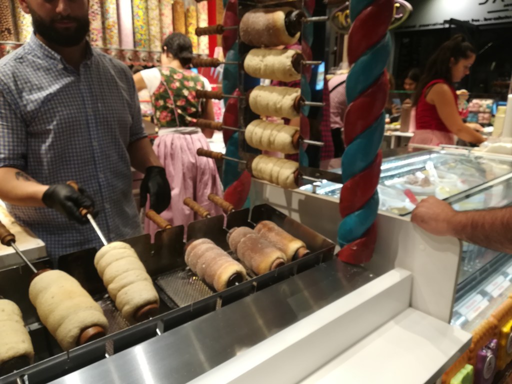 La sera andiamo finalmente a Heraklion, una città che mi incuriosisce per le contrastanti reazioni che scatena. C’è chi la definisce troppo moderna, chi troppo caotica, chi meravigliosa, chi tradizionale, chi troppo commerciale e via così. La prima cosa che penso quando ci arrivo è che è molto diversa da Chania, molto più moderna ma a suo modo bella. Mi lascio abbagliare immediatamente dai tanti negozi e dalla vivacità della sua piazza centrale, ricca di locali arredati con gusto e negli stili più disparati, dai più moderni e minimalisti ai più ricchi di particolari e legati alla tradizione greca. C’è un’incredibile viavai di gente, soprattutto giovani, quasi tutti in gruppi numerosi e allegri. Passiamo davanti al palazzo del Comune, in tipico stile veneziano e sapientemente illuminato in modo da metterne in risalto la bellezza. Proprio di fronte scopriamo un simpaticissimo locale chiamato Hansel e Gretel dove preparano i golosissimi trdlo, un tipico dolce cecoslovacco che abbiamo assaggiato pochi mesi fa nel nostro viaggio a Praga. Lo staff indossa uniformi a tema, con camice a sboffo e colorate salopette. Mando subito una foto alla cousin Marina per ricordarle il viaggio che ha condiviso con noi a Praga. Un ragazzo gentile mi dice che posso anche entrare e fare tutte le foto che voglio ma declino l’invito giusto per non cadere nella tentazione di affogarmi in questo squisito dolce.