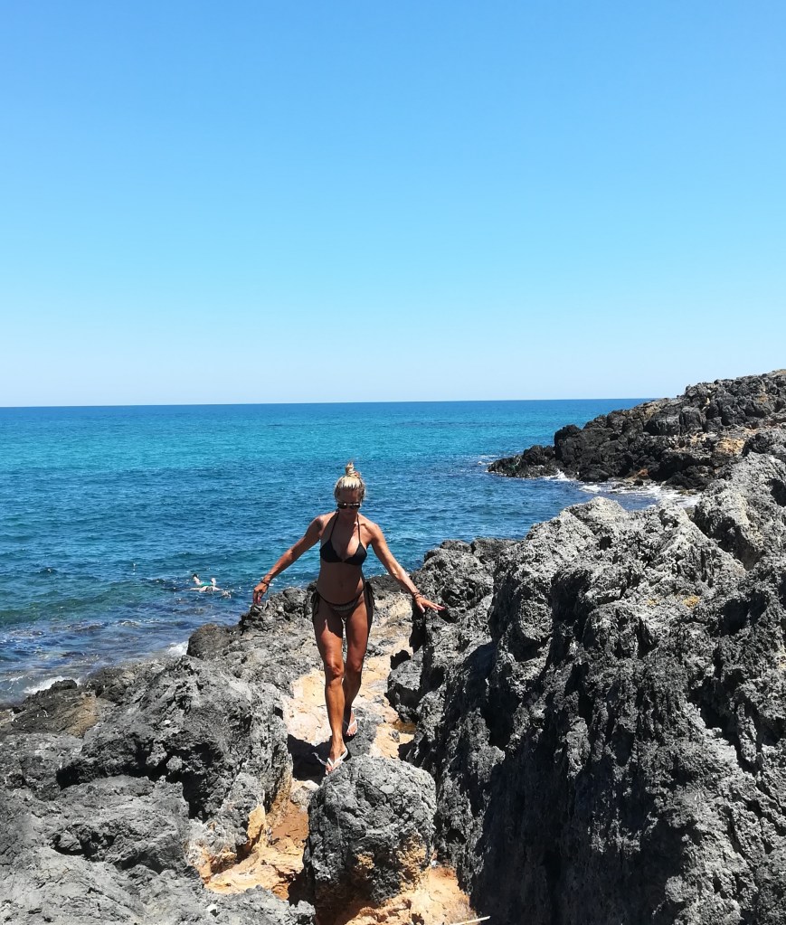 La strada che costeggia la spiaggia di Malia è molto lunga e nella parte centrale i giudizi letti rispecchiano la realtà. Quad che spuntano dappertutto, gente che parcheggia in modo selvaggio e pedoni che attraversano a destra e sinistra, facendoci letteralmente passare la voglia di avvicinarci alla spiaggia. Proseguiamo per il lungo litorale scegliendo un luogo più tranquillo. Ci imbattiamo in alcune baie semi deserte delimitate da pietre e facciamo una lunga passeggiata sopra delle rocce scurissime, a tratti quasi nere.