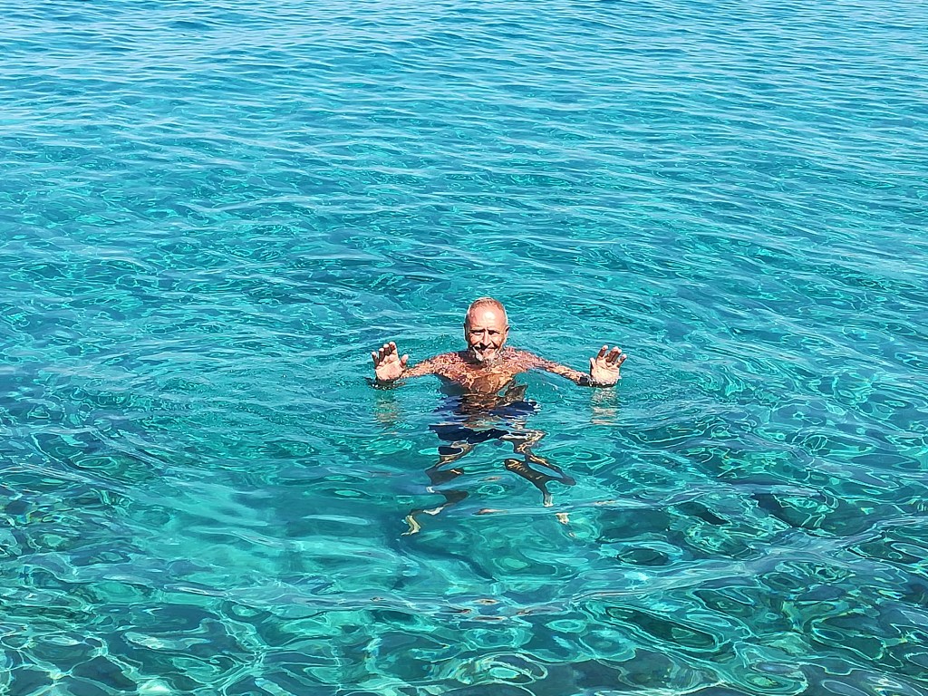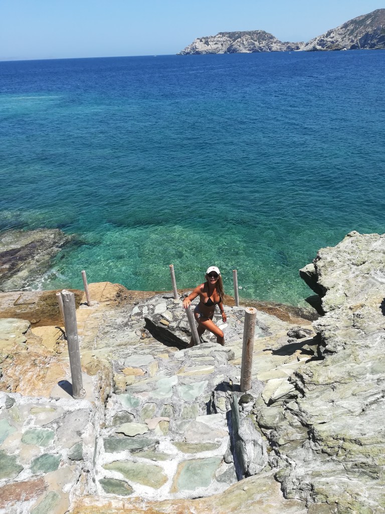 L’acqua è invitante, limpida e fresca e col caldo che fa è un richiamo a cui non ci si può sottrarre. Sott’acqua ci sono delle vecchie lastre piatte di pietra, testimoni, forse, di un antico porto.