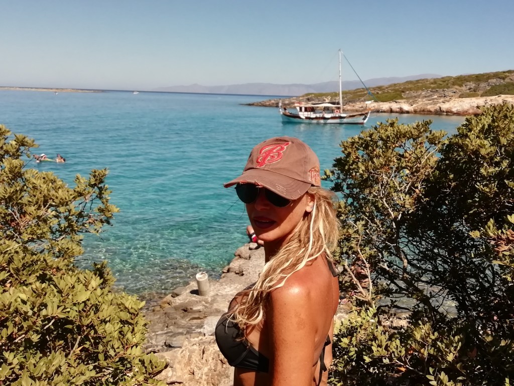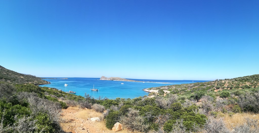 Ci rimettiamo in strada e raggiungiamo l’isola di Kalydon, unita a Creta da un istmo che parte vicino a Elounda, un vivacissimo paese a nord-est di Creta. Imbocchiamo una strada bianca che indica una spiaggia e avanziamo per qualche km, senza avere idea di cosa troveremo. Incontriamo degli altri avventori che tentano di parcheggiare tra sabbia e rocce facendoci pensare che tale spiaggia dev’essere degna di nota. Non senza difficoltà parcheggiamo anche noi e imbocchiamo una disagevole discesa. Sotto di noi il mare ha incredibili sfumature di blu, mettendoci le ali ai piedi. Quando ci arriviamo di fronte rimaniamo estasiati. Ho visto mari trasparenti, azzurri, quasi bianchi, verdi ma un azzurro così intenso non l’avevo mai visto.