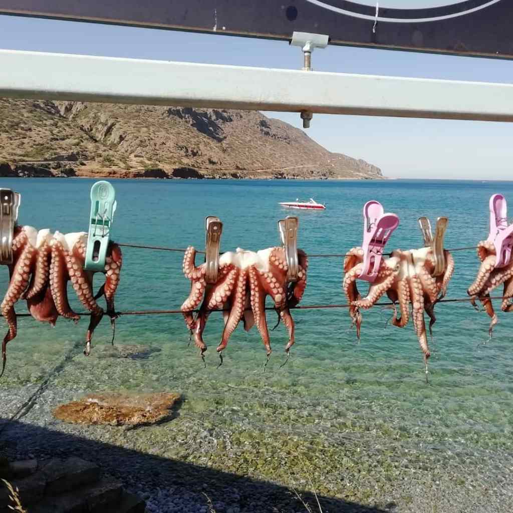 Gli hotel e le ville sono pochi ma lussuosi, con una spettacolare vista sulla baia e su Spinalonga. Qui, per la prima volta in vita mia, vedo i poveri polipi appena pescati appesi ad asciugare come panni appena lavati, con le mollette a pizzicarne i tentacoli e l’acqua salata gocciolante sul tipico terreno di calce e pietra grigia.