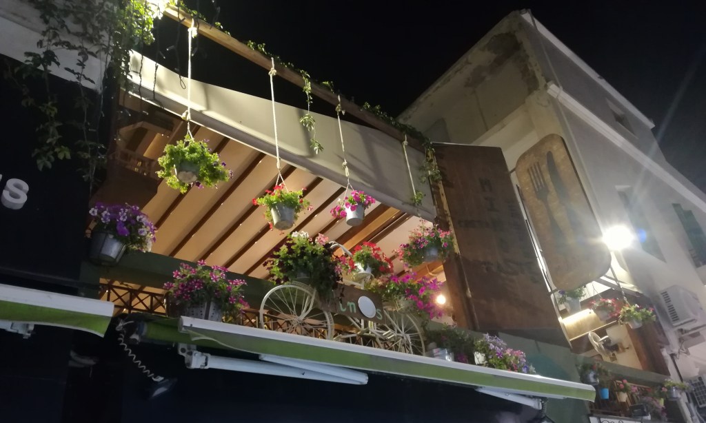 La nuotata e la passeggiata ci hanno fatto venire fame e la visione dell’Almyra con quella sua atmosfera di mare sembra volerci far desistere dall’intenzione di mangiare solo la frutta che ci eravamo portati. Ci accomodiamo e facciamo alcune delle più belle foto fatte durante queste vacanze. L’azzurro del mare sullo sfondo e le ombre create dal pergolato del ristorante creano un effetto davvero scenografico.