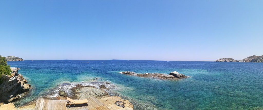 Agia Pelagia la scegliamo perché è a soli 15 km da noi e perché tutti ce ne hanno parlato bene. La strada principale corre spesso sopra il mare offrendo scorci incantevoli. Cominciamo a scendere verso la spiaggia fino ad un parcheggio dove, con pochi euro, possiamo parcheggiare e avere pure, mostrando lo scontrino, uno sconto sulla consumazione nel vicino ristorante. Bel sistema!