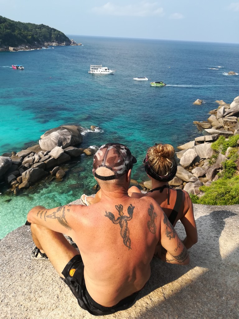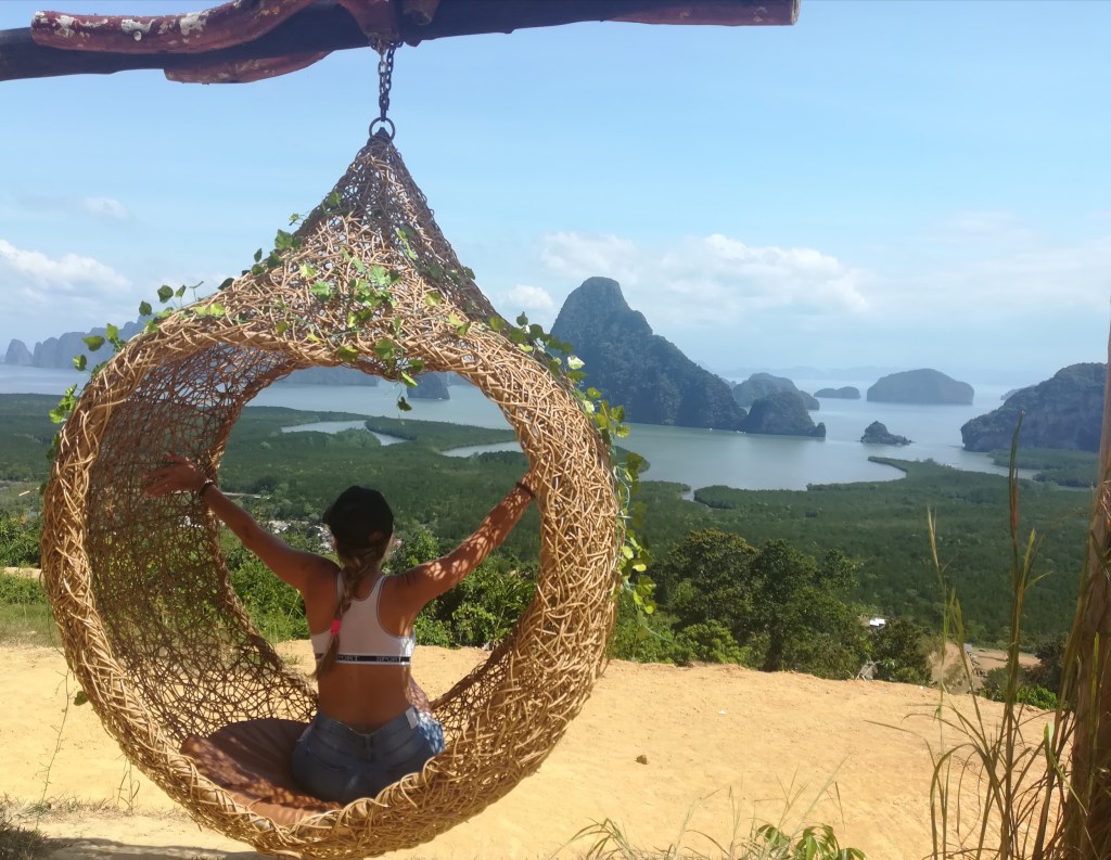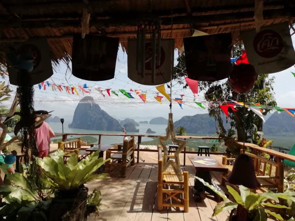 Il navigatore ci porta proprio a ridosso della collina che sale al view point. Ci sono due modi per arrivarci, a piedi oppure a bordo di alcuni pick up che fanno spola avanti e indietro per i turisti più pigri o per chi non se la sente di affrontare la salita sotto un sole cocente. Non sia mai che noi ci facciamo trasportare, vuoi mettere la soddisfazione di arrivare in cima dopo una faticosa camminata? Così, pagando pochissimi bath per entrare nell’unica strada percorribile, ci avviamo, facendo attenzione ai pick up pieni di turisti festosi che ogni tanto ci passano accanto alzando nubi di polvere rossa. In meno di mezz’ora raggiungiamo la cima e lo scenario che ci si apre davanti è davvero spettacolare, fatto di un’infinità di isole di ogni forma e dimensione che emergono dal mare e che con la loro vegetazione verdissima offrono un incredibile contrasto cromatico con l’azzurro del cielo e del mare. La natura ha certamente fatto la sua parte, ma anche l’uomo ci ha messo del suo, costruendo altalene e sedie a forma di cuore o a mezza luna, sedute ideali per indimenticabili scatti fotografici.