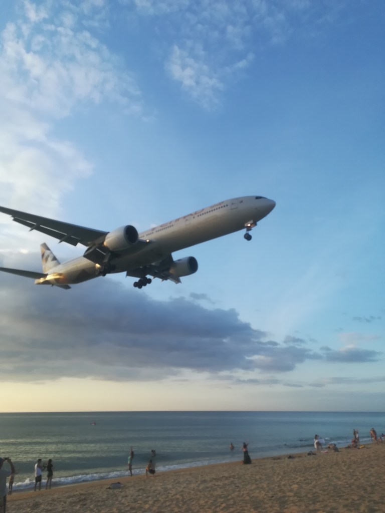 A circa 1 km di distanza da noi, vediamo un gruppo di persone tutte unite in un unico punto e dopo un attimo capiamo perché siano lì. Tutti guardano verso il cielo dove vediamo spuntare un’enorme sagoma che si avvicina velocemente e che in pochissimi secondi ci passa sopra la testa per poi atterrare all’aeroporto che è separato dalla spiaggia solo da un’altissima rete metallica. Lo spettacolo è davvero impressionante, alzare gli occhi e trovarsi sopra il naso la pancia di questi bestioni, assieme al rombo imponente dei loro motori, fa rabbrividire.