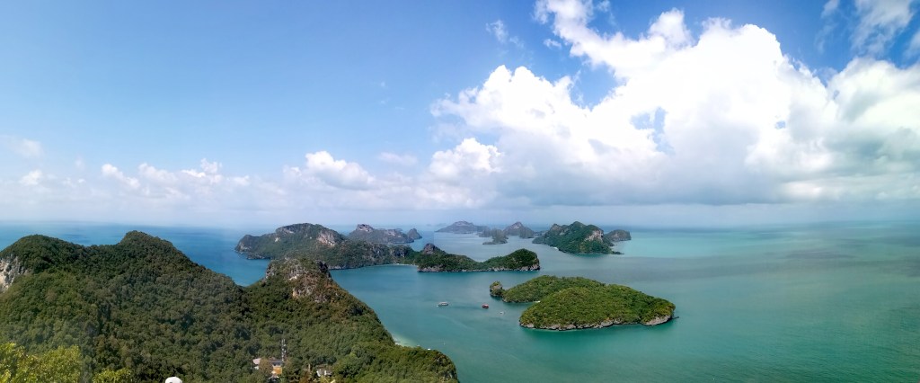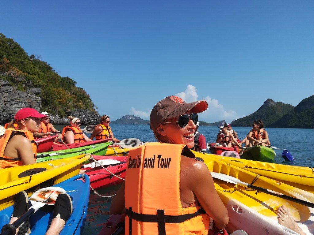 La visita più bella ce la lasciamo per l‘ultimo giorno: Ang Thong National Park, un arcipelago protetto formato da 42 isole che si trova nel golfo della Thailandia, a nord-ovest di Koh Samui. L’unico inconveniente è che non c’è modo di andarci per proprio conto, bisogna affidarsi ad uno dei tanti tour che provvedono ad organizzare l’intero programma, dal pick up in albergo, al pranzo, all’itinerario completo e al ritorno in hotel. L’unica cosa che si può scegliere è il tipo di barca con cui raggiungere l’arcipelago. Ci sono le barche veloci che prevedono un itinerario più lungo oppure le barche più lente che offrono un tragitto più breve ma soste comunque interessanti. Optiamo per queste ultime, avendo fatto una poco simpatica esperienza con quelle veloci per andare alle isole Similan. Il programma è ricco: snorkeling su acque cristalline, visita a spiagge incantevoli, vista mozzafiato da un view point, pranzo in barca con prodotti tipici e perfino una traversata in canoa passando per gole e insenature naturali del Golfo del Siam