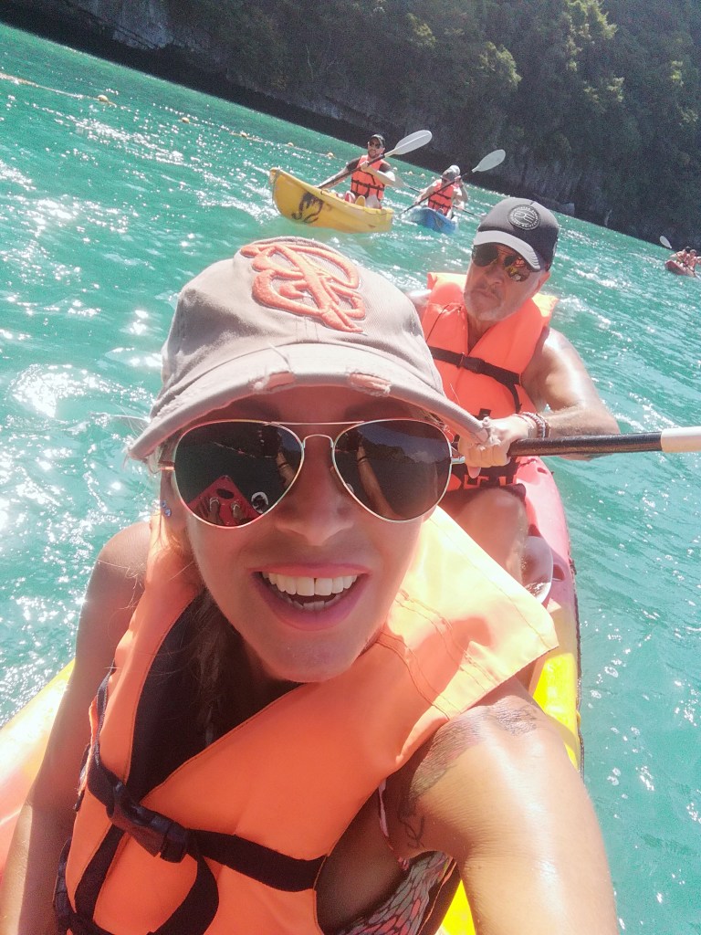 Partenza in perfetto orario con un furgoncino che ci porta fino all’imbarco. Conoscenza con la nostra guida, un simpatico omone che ci spiega tutto per filo e per segno mentre già navighiamo, gustandoci nel contempo una buona colazione con frutta, croissant, caffè e bibite. L’omone ci presenta anche Cristina, la guida che ci accompagnerà in canoa, un’atletica signora tedesca di circa 60 anni che vive in Thailandia da moltissimo tempo. Con il suo fisico asciutto e la pelle abbronzata piena di rughe ricorda molto i pescatori che passano le loro giornate sotto il sole. Suggestivo sentirla parlare fluentemente il tailandese dando veloci ordini ai marinai. È proprio lei che ci accompagna nella prima discesa in mare. Fa salire tutti con calma nelle rispettive canoe e ci raccoglie tutti in circolo dandoci le istruzioni per arrivare sulla terraferma. Tra tutti, saremo circa una decina di canoe, c’è sempre quello che si distrae e pensa bene di cadere in acqua. Non so bene come ma, due ragazzi inglesi vicino a noi, facendo non so che manovra, fanno rovesciare la canoa finendo dritti in acqua ma, con sollievo di tutti, senza nessuna conseguenza, a parte quella di farci sorridere e di farli arrossire.