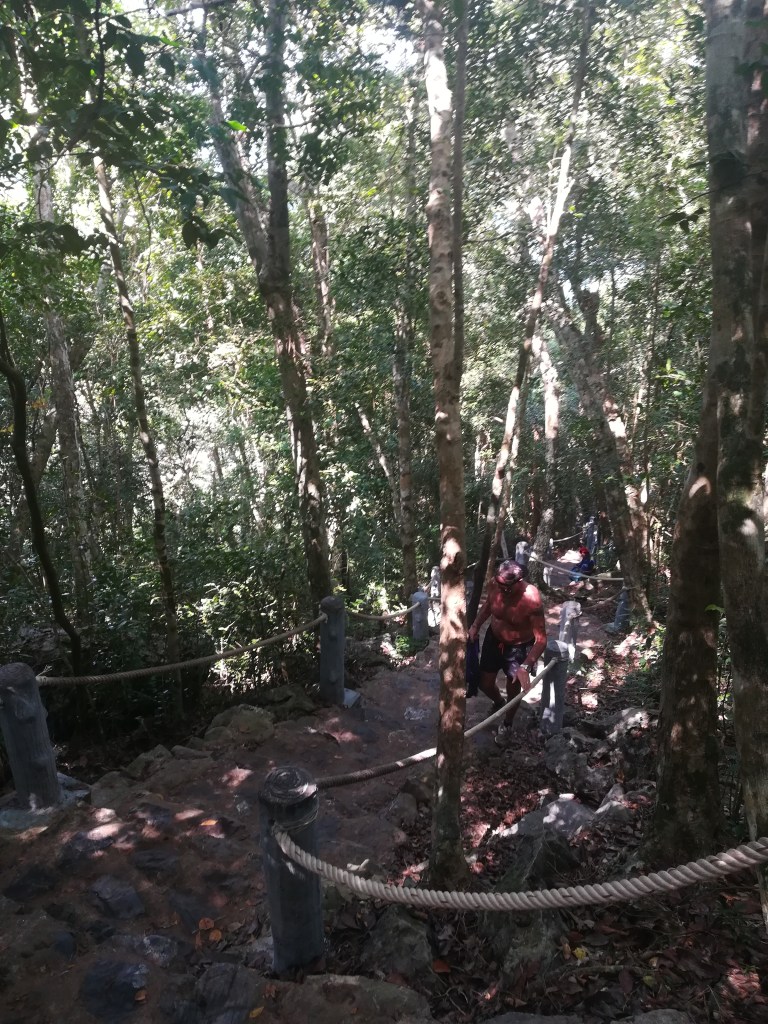 La salita è faticosa ma davvero entusiasmante, immersa in una vegetazione spettacolare dove, ogni pochi scalini, si apre un’indescrivibile visione sulla moltitudine delle isole sottostanti con le loro forme più diverse e con quei colori che riempiono gli occhi e il cuore.
