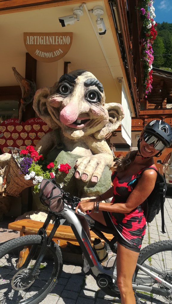 Ci muniamo di cartina e partiamo in direzione Malga Ra Stua, la prima delle 5 tappe previste. Seguiamo una vecchia strada militare asfaltata diventata ora ciclopedonale, dove c’è anche parecchia gente a piedi ma, sia noi ciclisti che i pedoni, siamo tutti molto attenti e rispettosi. Ci immergiamo quasi subito nella bellezza di questa pista, circondata da rocce, sentieri e perfino da un fiume del quale, ogni tanto, intravediamo piccole cascate. C’è anche qualche coraggioso che fa il bagno in quella che dev’essere tra le acque più gelide dei dintorni.