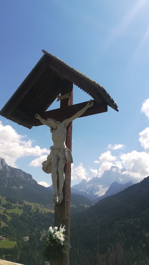 Ci fermiamo al punto panoramico, dove è stata posta una scultura raffigurante un albero caduto, in ricordo della tempesta Vaia che nel 2018 ha distrutto milioni di alberi.