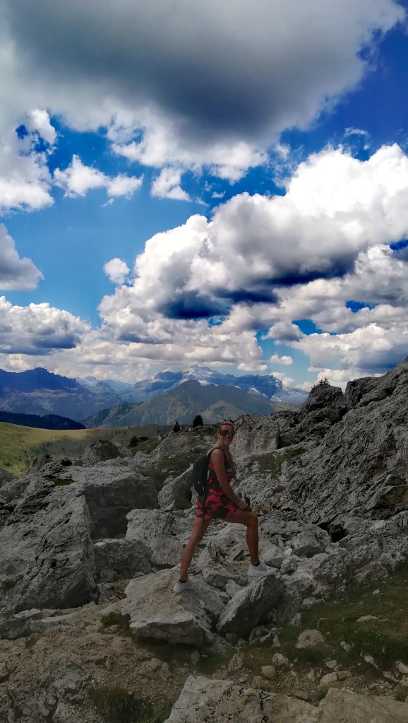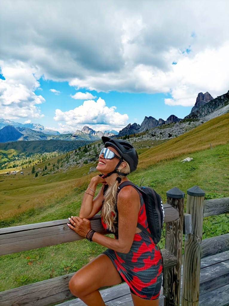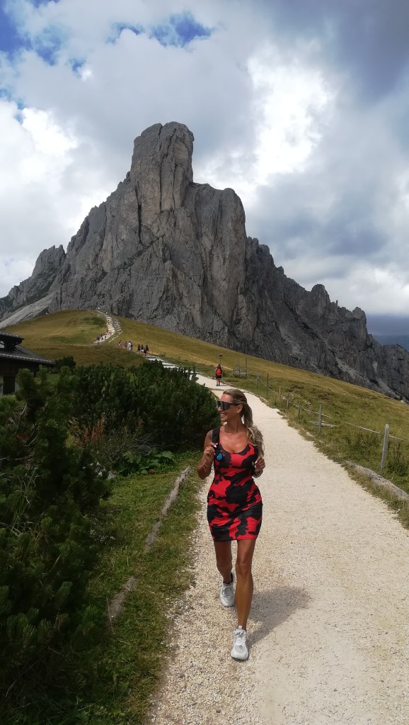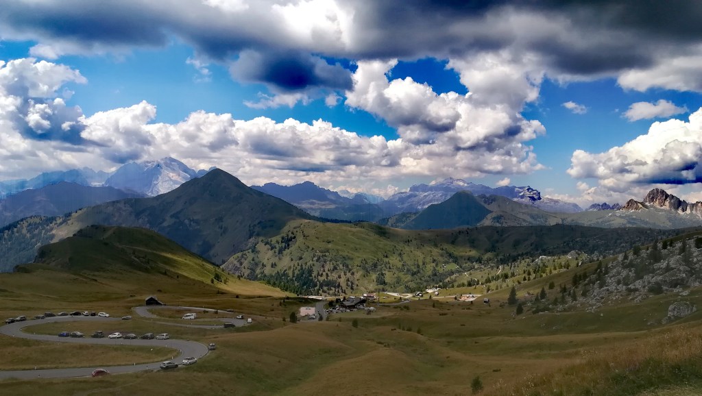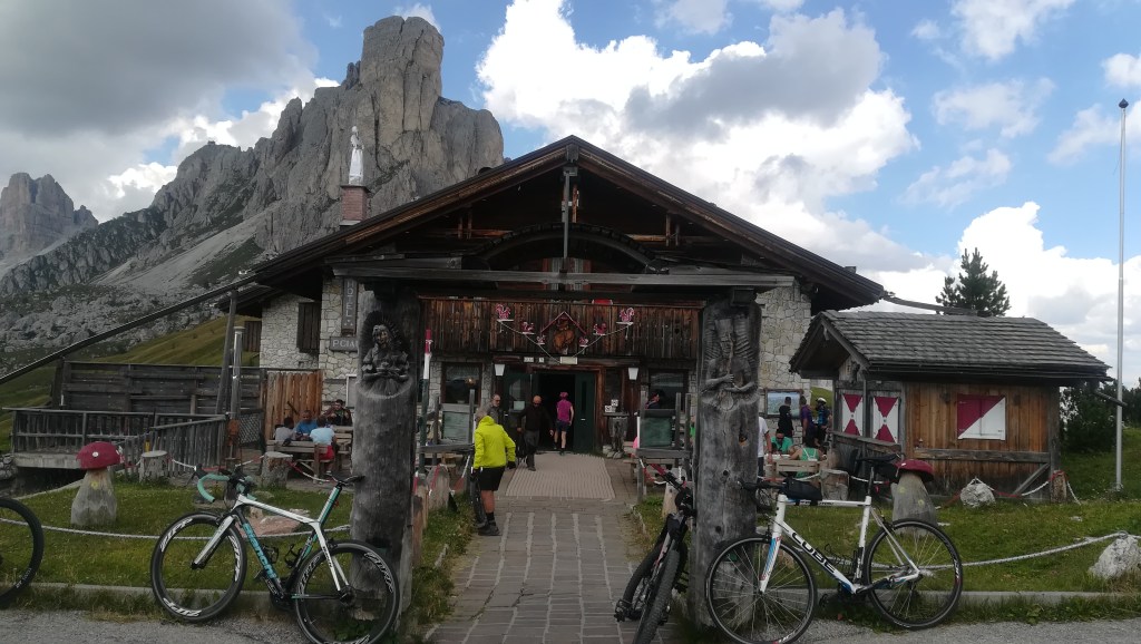 Passiamo a fianco al bellissimo ristorante che prende il nome dal passo e, al culmine della salita, rimaniamo senza parole. Le montagne ci appaiono improvvisamente davanti agli occhi in tutta la loro grandezza e bellezza. Vette dolomitiche a perdita d’occhio. Marmolada, Tofane, Pelmo, Croda Rossa, Averau, Nuvolau….tutto in un’unica visione dove persino le migliori cartoline riuscirebbero a sfigurare.