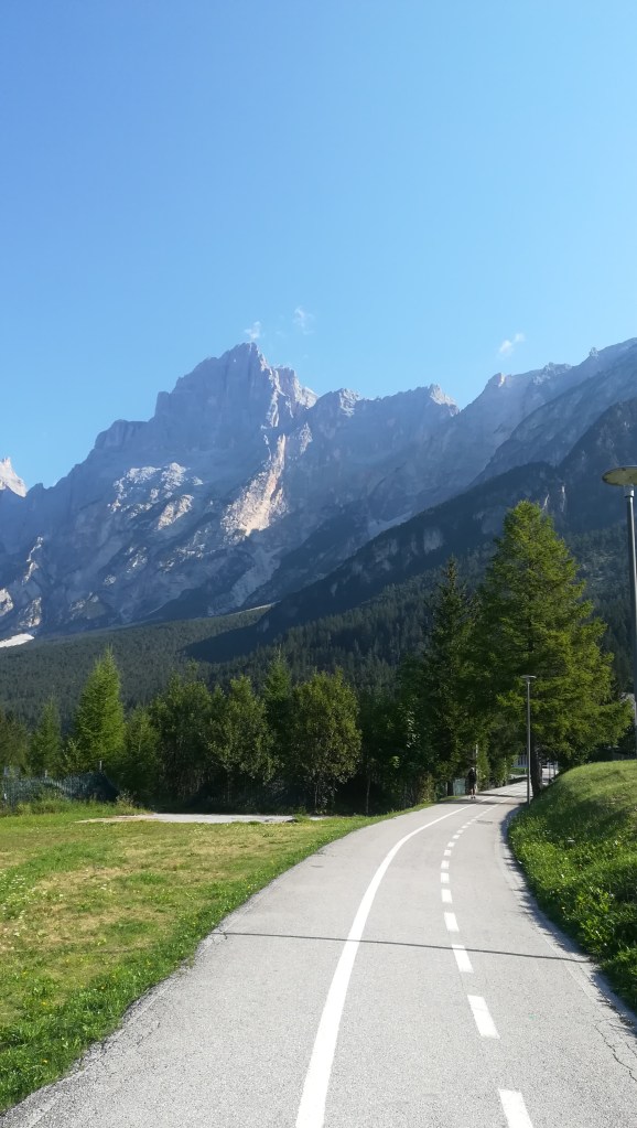 Difficile scegliere il percorso per il secondo giorno, ce ne sono così tanti qui che la scelta appare ardua. Ci lasciamo convincere dalla receptionist dell’hotel Trieste di San Vito di Cadore che, quando ci vede scaricare le bici dall’auto, ci consiglia immediatamente il tour dei 5 rifugi. Per la verità l’avevo già googolato ma le difficoltà descritte (salite con pendenze ardue, discese vertiginose, fondo sassoso e tratti a spinta) mi avevano frenato. Ma la passione con cui la receptionist me ne parla, essendo anche lei appassionata di ciclismo, mi convince.