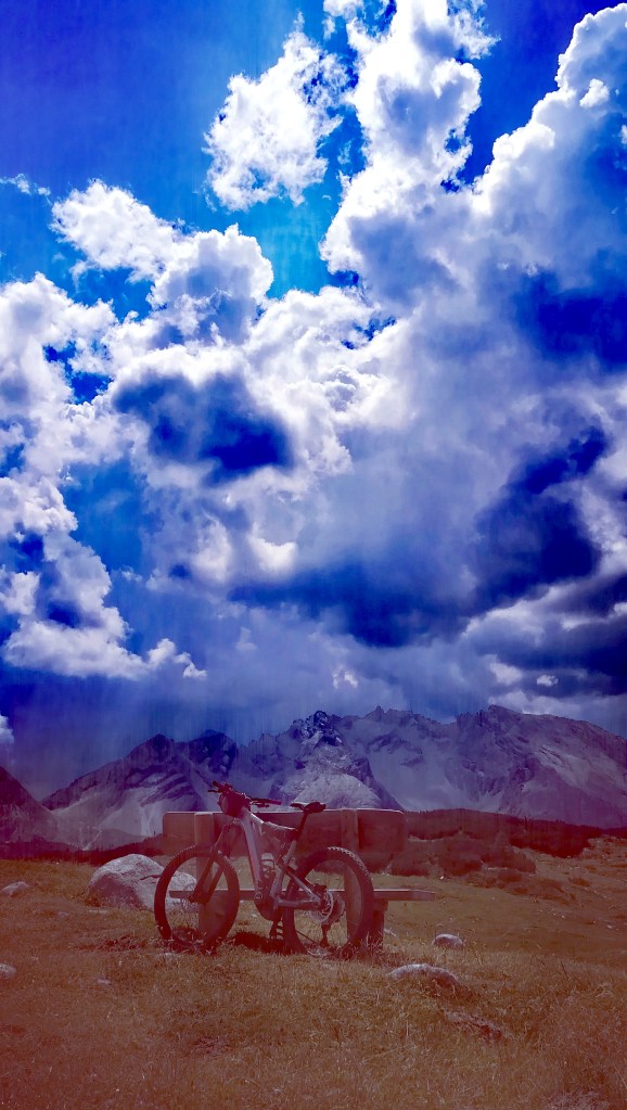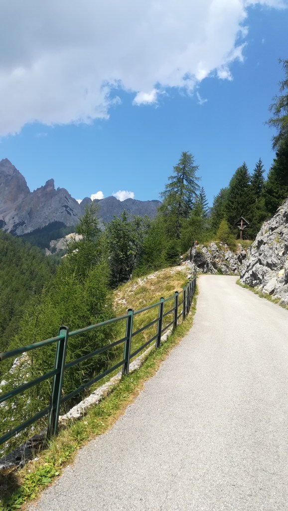 I pedoni che incontriamo sbuffano alla grande, anche per loro la fatica si fa sentire e il sole, che continua a splendere anche in mezzo a qualche nuvola scura, li fa sudare anche più di noi. Ciò che ci attende, comunque, ci ripagherà di tutto: una lunga e sinuosa strada bianca che sembra salire all’infinito con una miriade di vette sullo sfondo e una catena montuosa sulla destra di rocce rosa che contrastano con il verde degli innumerevoli mughi che ci circondano da ogni parte. Non ne avevamo mai visti così tanti tutti assieme. Ora capisco perché questo sia annoverato tra i percorsi più belli al mondo.