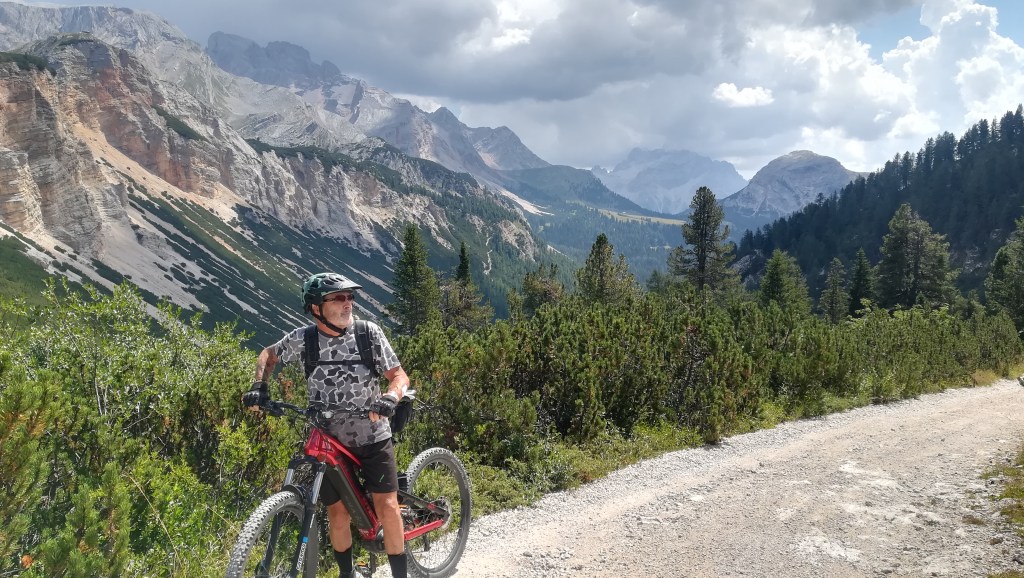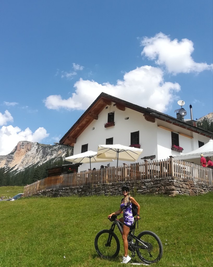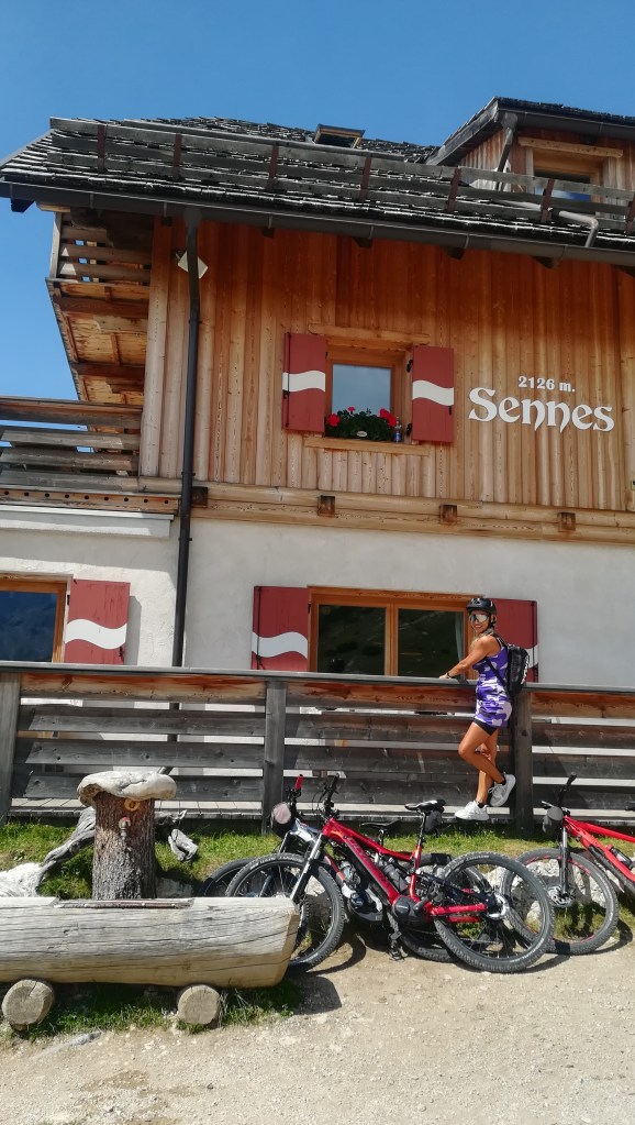 Affrontiamo qualche tratto sassoso abbastanza ripido e difficile ma le nostre e-bike (assieme a qualche buona pedalata) si comportano egregiamente. Tanto è l’entusiasmo per questo tour che non badiamo ai chilometri, così, quasi senza rendercene conto, arriviamo alla prima malga, la Ra Stua, porta d’ingresso al parco naturale di Fanes – Sennes- Braies , dove veniamo accolti da simpatiche mucche accoccolate su un verdissimo alpeggio sovrastato da questa accogliente malga dove decidiamo di tornare a mangiare.