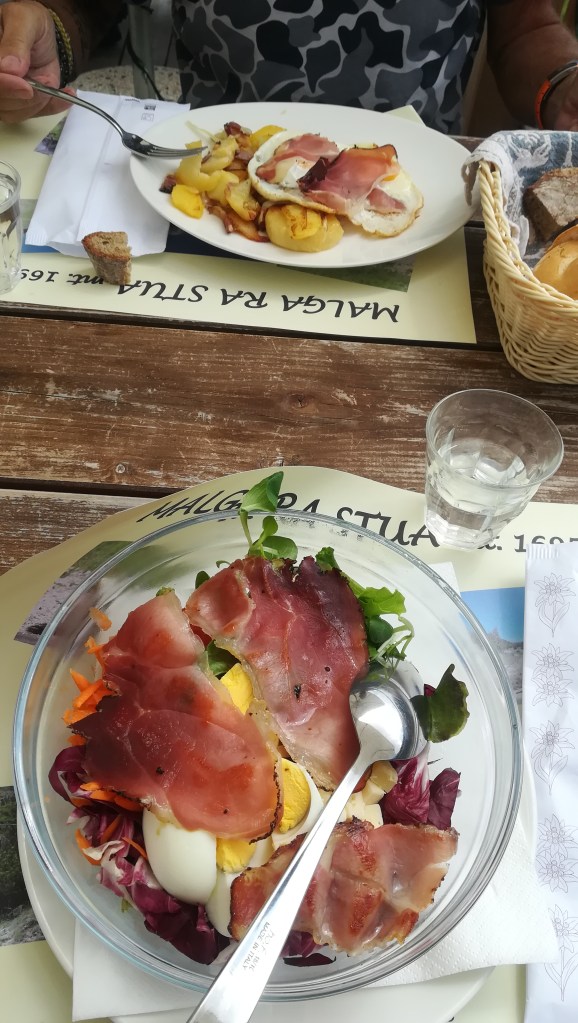 Ci vestiamo e ci tuffiamo (in senso letterale viste le pendenze) in discesa. Siamo di fretta ma il pranzo alla malga Ra Stua non ce lo perdiamo.