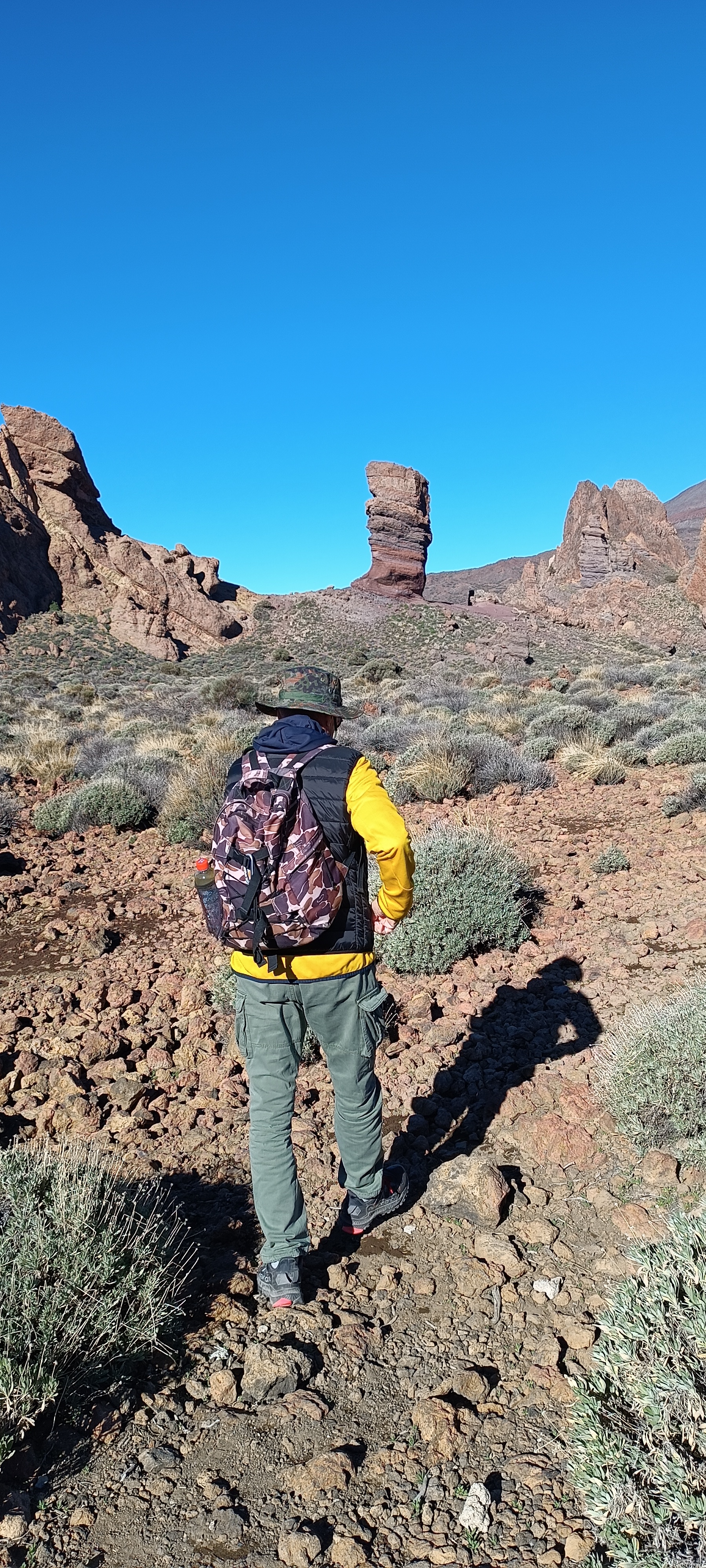 La giornata è perfetta, il cielo è di un azzurro accecante da quanto è limpido e il paesaggio, dapprima punteggiato di palme, piante grasse e giganteschi fichi d’India, vira poi in foreste di conifere che ci riportano alla mente i nostri monti, fino a trasformarsi in distese di vecchie colate laviche nere e frastagliate che, con la vetta del Teide spruzzato di neve sullo sfondo, regalano una visione di una bellezza che non mi aspettavo.