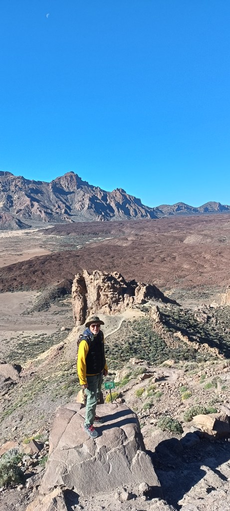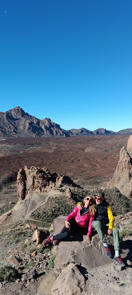Lasciamo lì l’auto e attraversiamo la strada verso il mirador del Roques de Garcia, un gruppo di formazioni rocciose modellate dall’erosione del tempo. Devo proprio dire che per un attimo rimaniamo abbagliati. A destra una miriade di rocce multicolori dalle improbabili forme immerse tra basse rocce rosse e resistenti cespugli e dall’altra una distesa di terra marrone incastonata tra innumerevoli cime dove perfino la luna fa la sua comparsa. Indimenticabile!