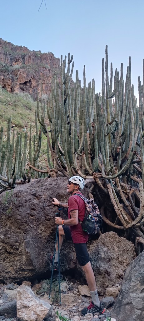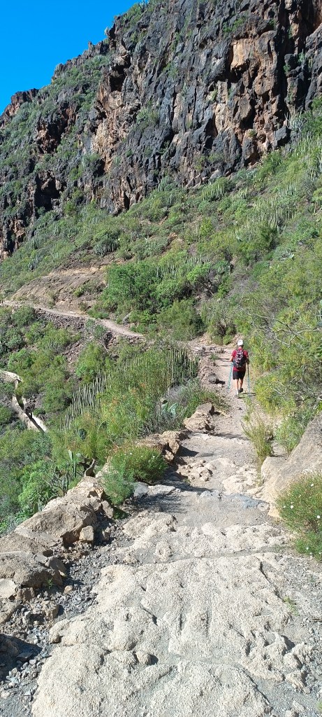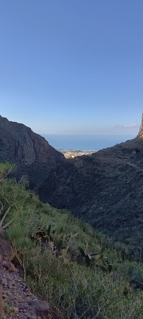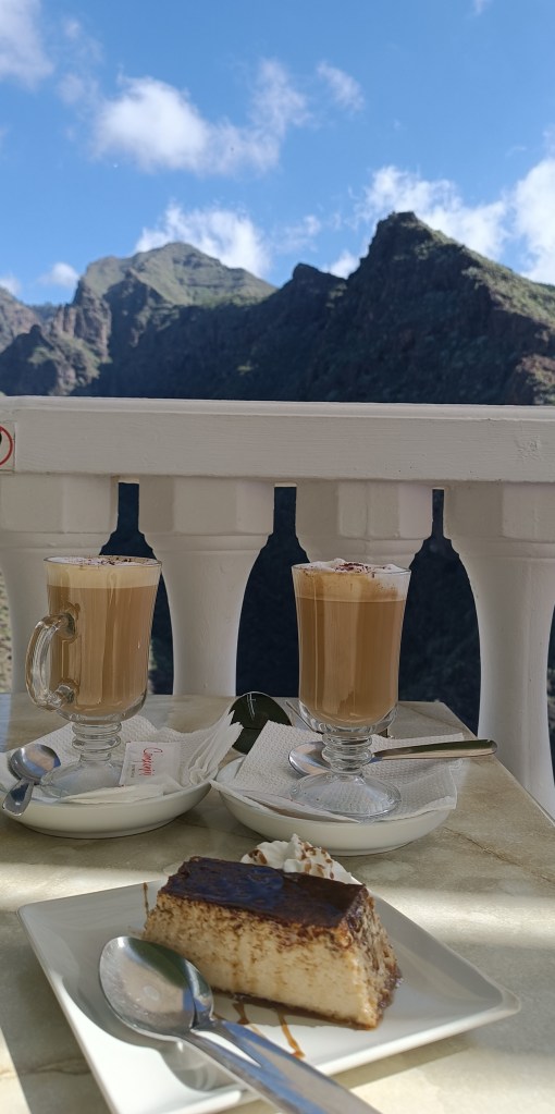 Il sole che all’andata era nascosto dietro il monte, obbligandoci ad indossare la felpa che ci eravamo portati, al ritorno ci fa compagnia per buona parte del tratto finale rendendo ancora più piacevole la discesa. Dulcis in fundo, il ristorante Otelo, posto proprio all’entrata/uscita del sentiero, ci delizia di uno strepitoso quesillo (tipico e STREPITOSO dolce canario) accompagnato da un buonissimo café con leche e un incomparabile panorama.