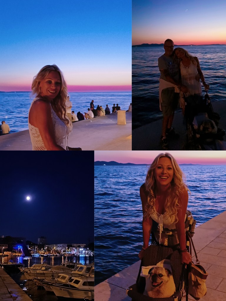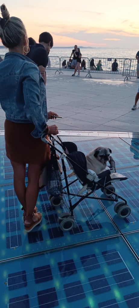 E proprio mentre spaziamo con gli occhi tra tutti questi colori, ci sembra di sentire un enorme pesce parlare dal centro del mare. E’ il suono dell’organo Marino, un’opera ideata dallo stesso architetto del Saluto al Sole, formato da 35 canne d’organo di diversa forma e inclinazione immerse nel mare che, grazie al moto ondoso, producono suoni continuamente diversi. E’ un’esperienza davvero toccante: da una parte i colori del sole che se ne va e dall’altra una luna quasi piena che riempie di riflessi il mare e…noi tre, con Giottino che si gode l’aria più fresca della sera e si lascia trasportare felice e curioso tra gli sguardi divertiti dei passanti al vedere un cane in un passeggino da bambino.