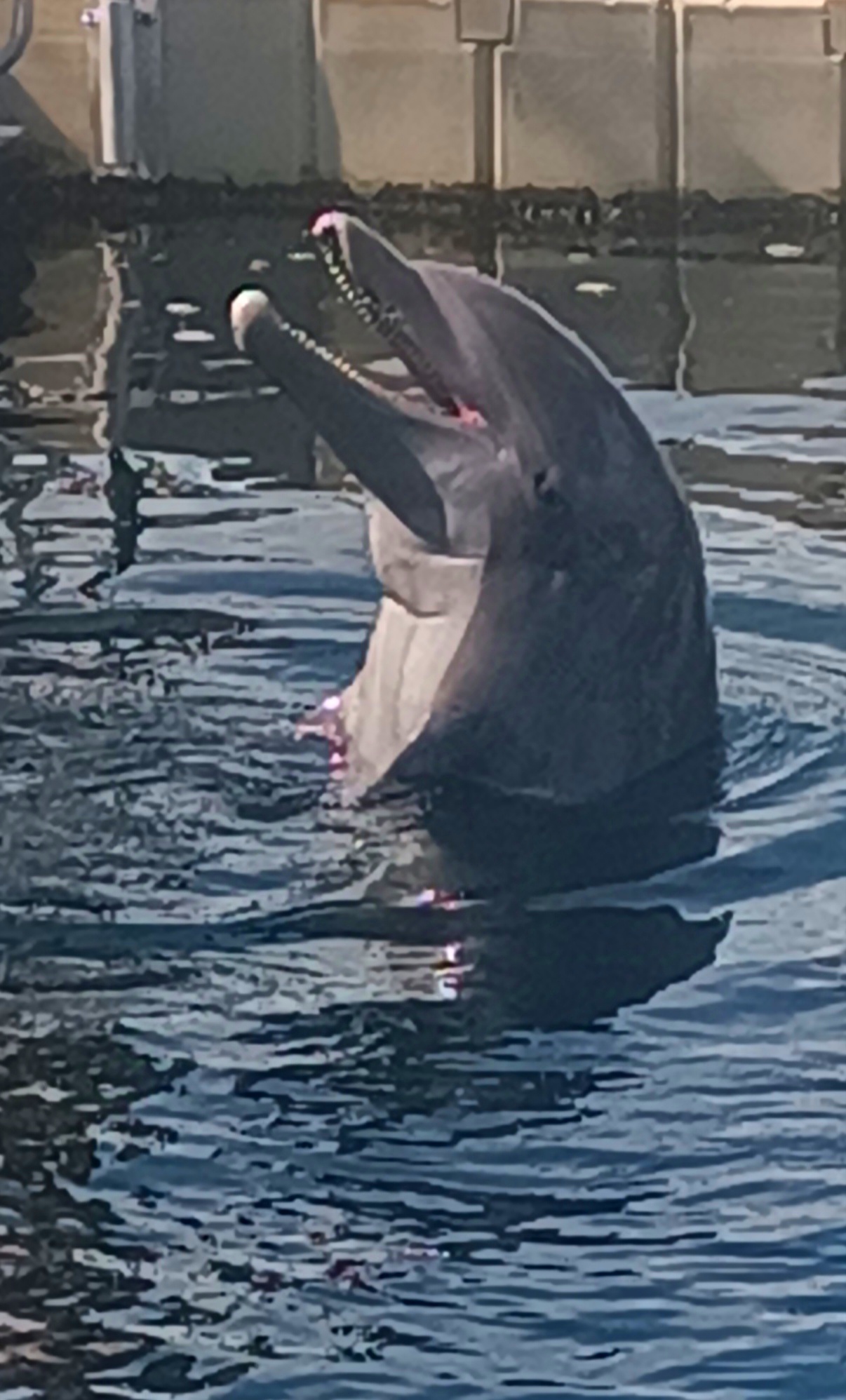 Siamo sul bordo delle vasche, vicinissimi a loro che, in un’alternanza di nuotate sinuose e rincorse velocissime, ci passano accanto lasciandoci ogni volta a bocca aperta. Sono stupendi! Dopo pochi minuti le istruttrici abbassano una pedana dove si erano già posizionati i bimbi per entrare in acqua. Ecco, qui siamo contenti di essere fuori. I bimbi, pur emozionati per la vicinanza dei delfini, tremano di freddo. Però sono sicura che sarà comunque bellissimo per loro accarezzare e giocare con questi splendidi mammiferi.